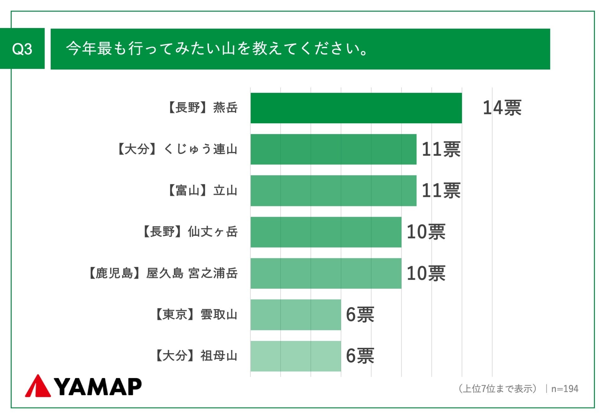 「Q3.今年最も行ってみたい山を教えてください。」(n=194)と質問したところ、「【長野】燕岳(つばくろだけ)」が14票、