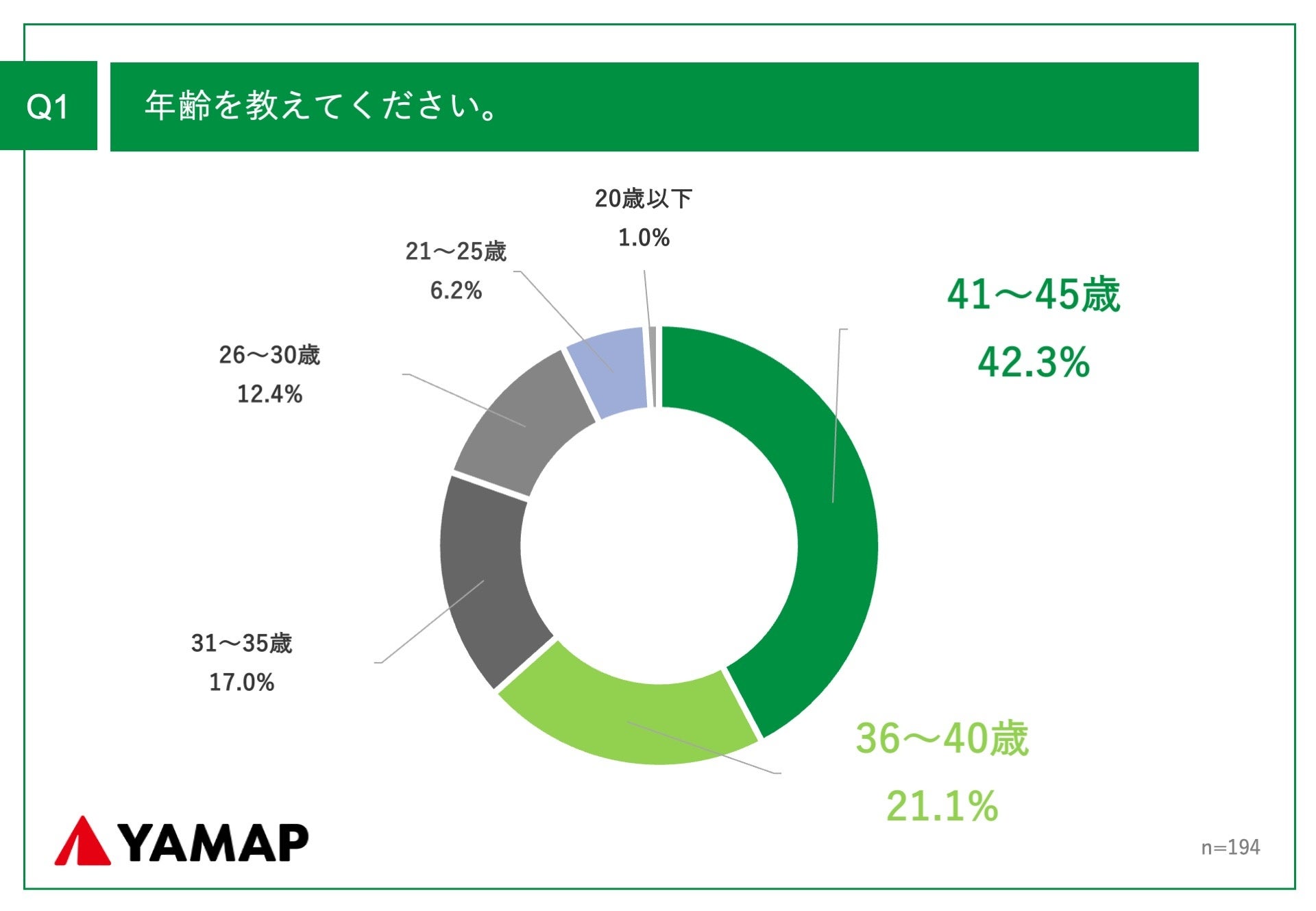 その他「Q1.年齢を教えてください。」(n=194)と質問したところ、「41〜45歳」が42.3%という回答となりました。