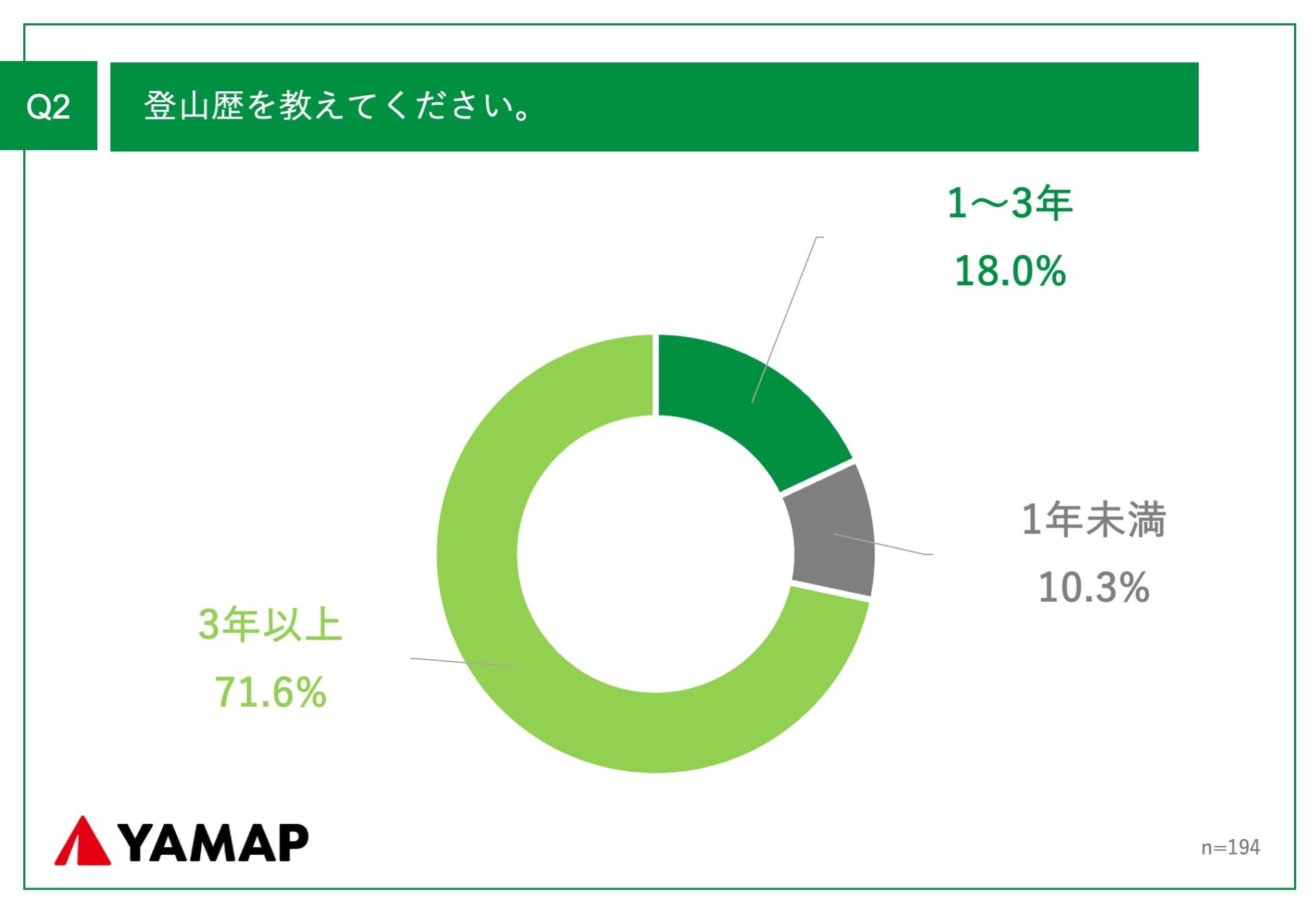「Q2.登山歴を教えてください。」(n=194)と質問したところ、「3年以上」が71.6% という回答となりました。