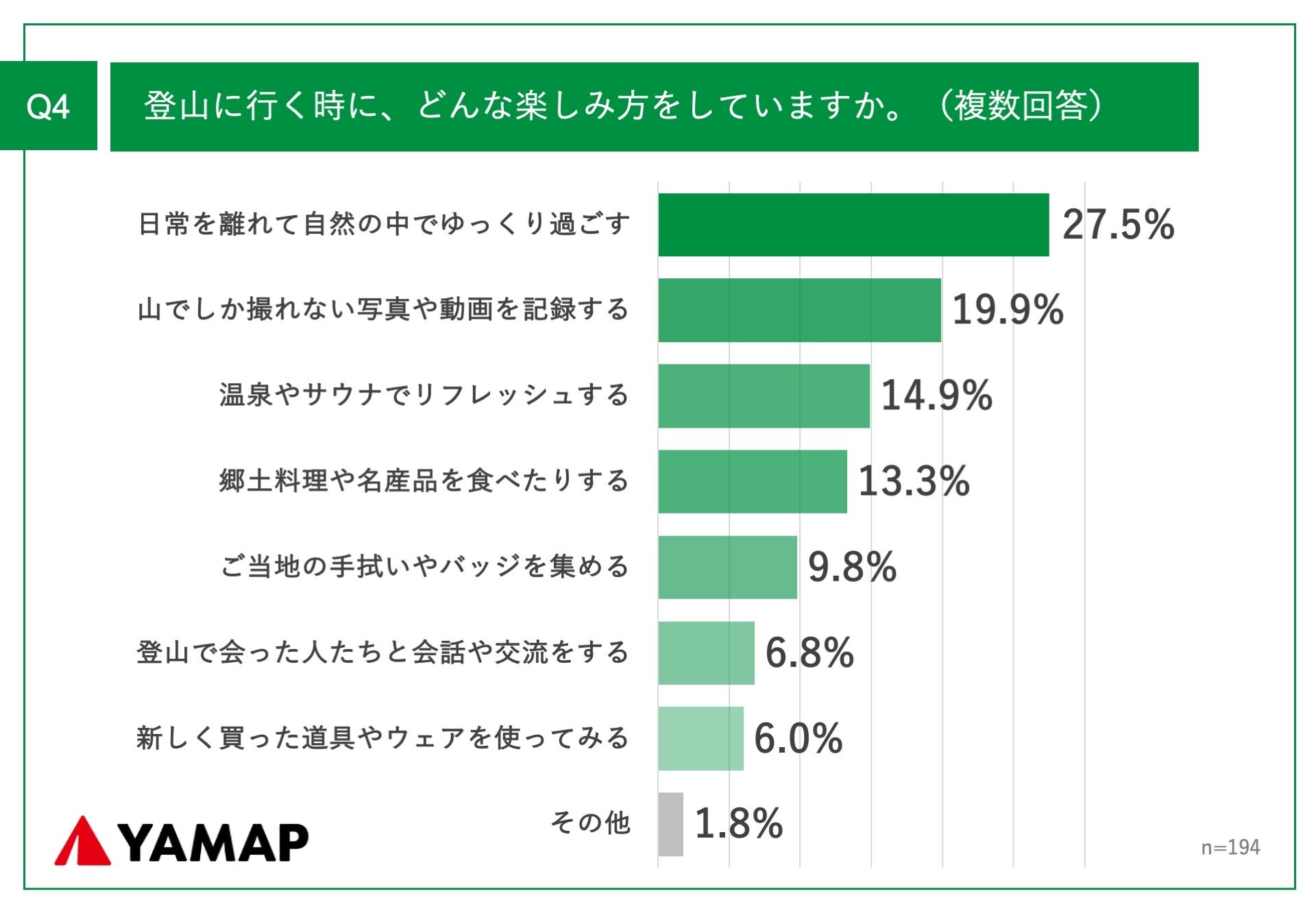 「Q4.登山に行く時に、どんな楽しみ方をしていますか。(複数回答)」(n=194)と質問したところ、「日常を離れて自然の中でゆっくり過ごす」が27.5%、「山でしか撮れない写真や動画を記録する」が19.9%、「温泉やサウナでリフレッシュする」が14.9%という回答となりました。