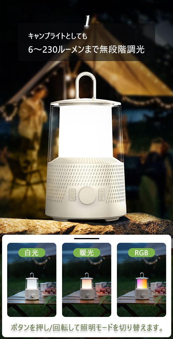 白光・暖光・RGBの3つのモードをニーズに合わせて切り替えることができます。 同時に、ライト調整ボタンを回転させることで明るさを調整できます。