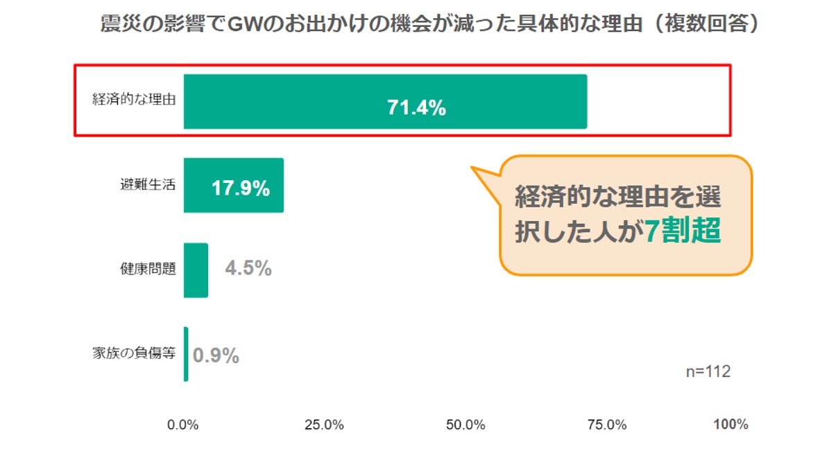また別の設問で、「震災の影響で、(昨年と比較して)ゴールデンウィークのお出かけの機会が減った」と回答した人について、その理由をたずねると7割超が「経済的な理由」と答えました。