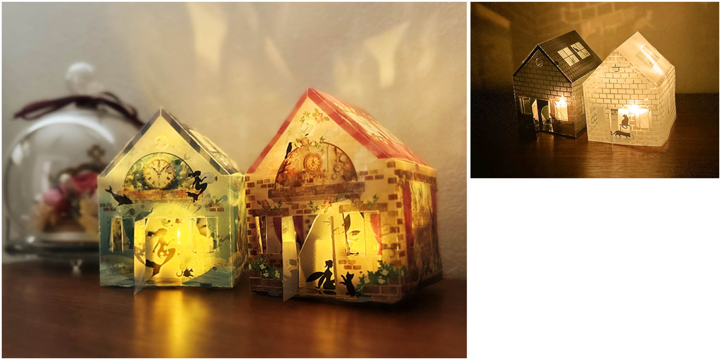 LEDキャンドルの明かりが揺らめく小さな家のランプシェード。メルヘンな2種、シンプルな2種の全4種展開。明かりがもれる窓から中を覗けば、楽しい住人たちに出会えます。デスクに置いてさりげないアクセントに、枕元に置いておやすみ前の癒やしのひとときに。キットは20分ほどで組み立てが可能です。