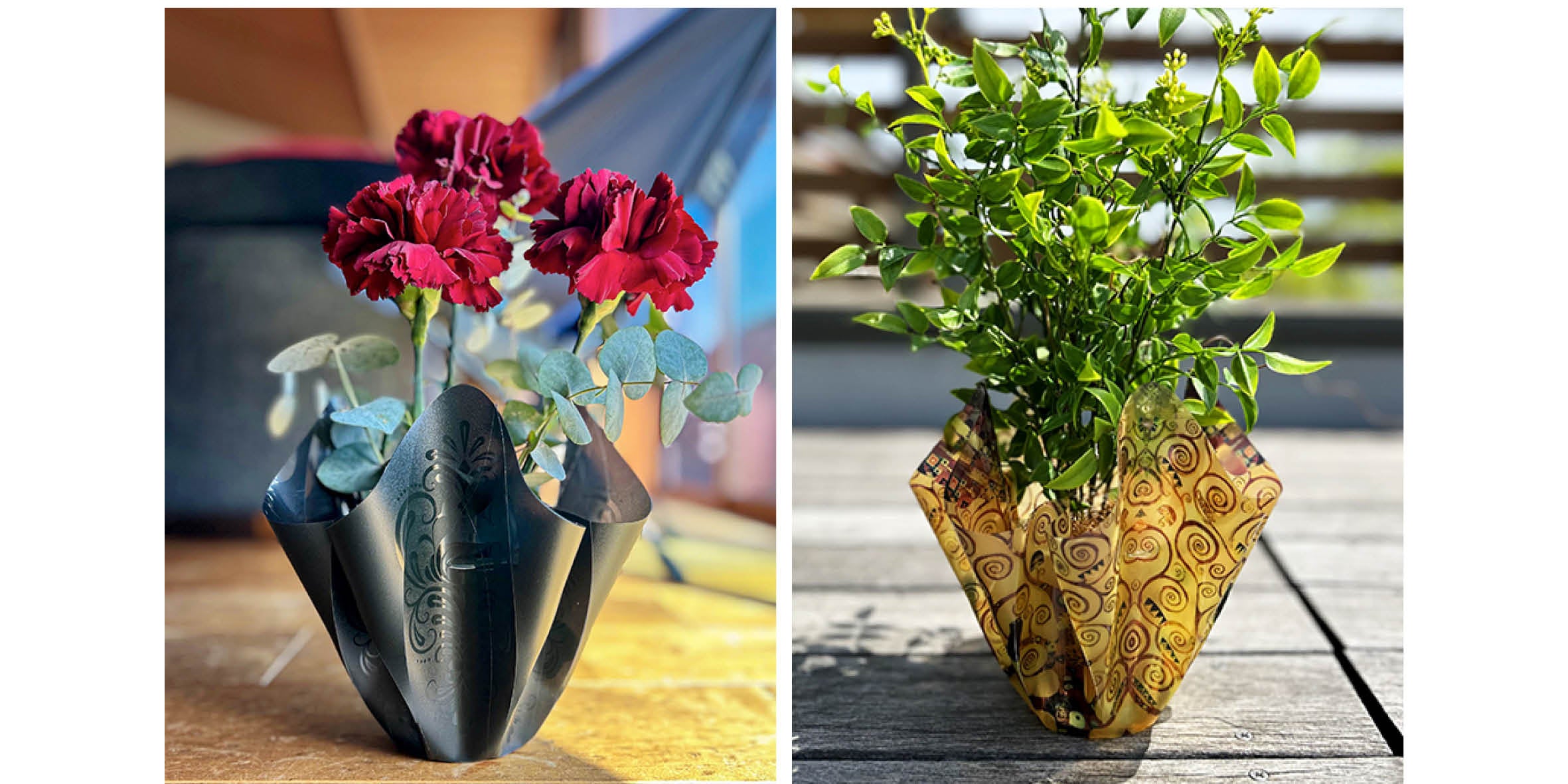 1枚のシートで包みこむように作るシンプルな構造で、美しい曲線美を楽しめるハイセンスなフラワーベース。⽔を⼊れての使⽤にも対応します。