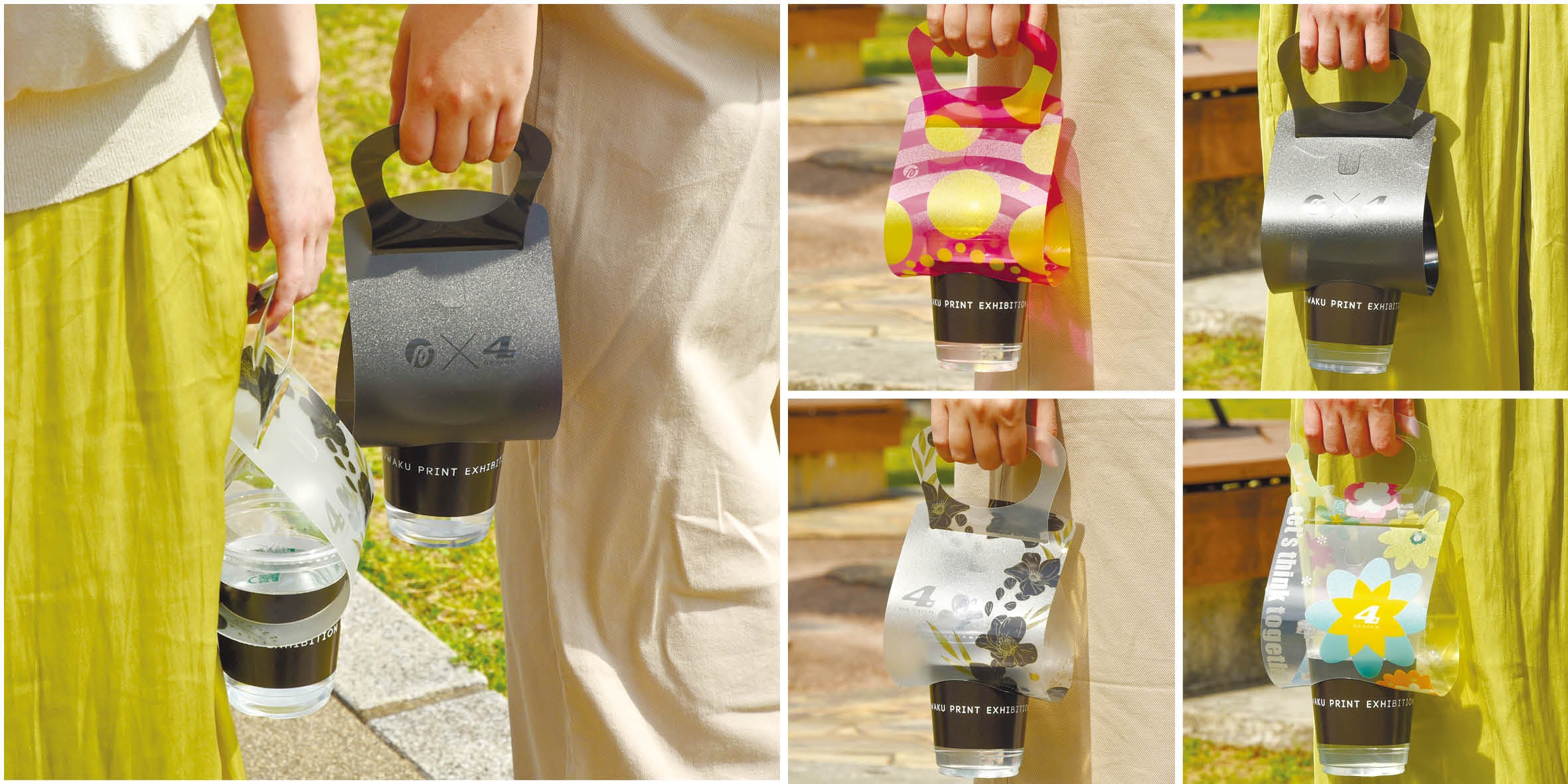 プロダクトデザイナーの手による流麗なフォルムが美しいカップホルダー。擬似エンボス印刷でクリアとマットの両方の質感を活かしたデザインが可能になりました。サンプルはテイクアウトカフェのLサイズに対応。中央の穴にカップを差し込み、持ち手をスリットにくぐらせるだけの簡単セットで、吊り下げて持ち運びができます。テーマパークや各種イベント、フェスやスポーツ観戦など、オリジナルデザインのカップルン♪はファングッズとしてのニーズにも応えます。