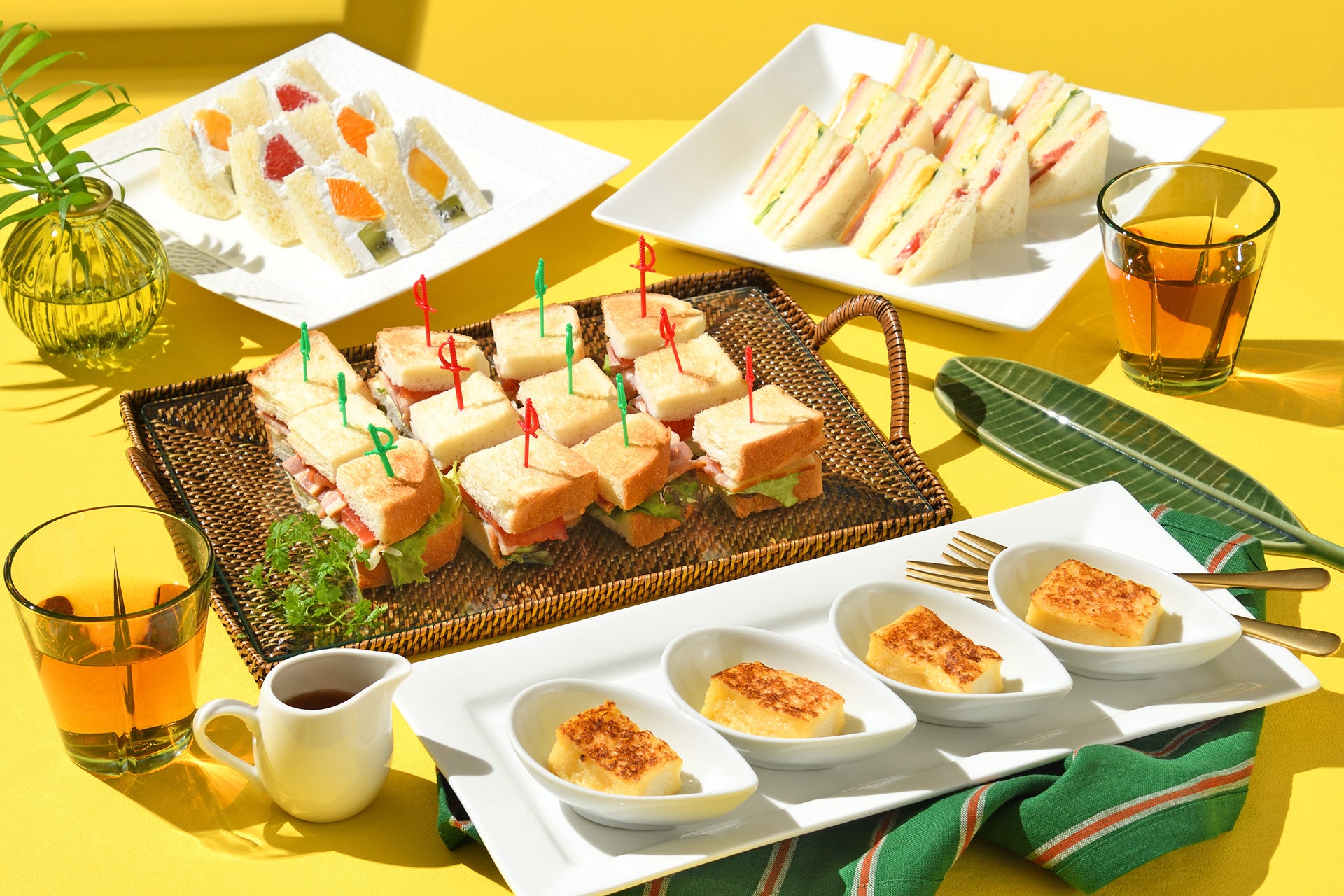 夏の美味しさをスイーツにぎゅっと閉じこめました。マンゴーのショートケーキ、キャラメルバナナクグロフ、オレンジのシブースト、はちみつレモンムースなど、パティシエ自慢の夏の味わいが勢ぞろい。