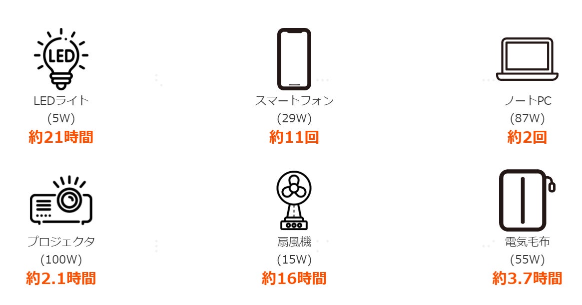 スマホやパソコンはもちろん、ライト、小型炊飯器、小型車載冷蔵庫、扇風機、電気毛布、プロジェクターなど様々な家電製品に対応しており、日常使いやアウトドア、防災など活用シーンは様々。軽量・コンパクトで持ち運びがしやすく、かつ容量・出力ともにパワーアップした本商品は、特にひとり暮らしの方の防災やソロキャンプといったシーンでお使いいただきやすいよう設計しています。