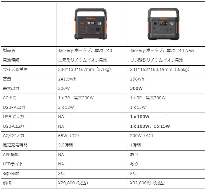 • 旧モデル「Jackery ポータブル電源 240」との比較