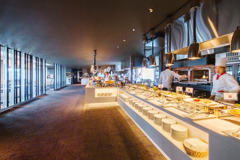 最上階、地上50メートルからの景色を眺めながら、四季折々の食材を楽しむ開放的なダイニング。躍動感あふれる「炎のライブキッチン」にシェフが腕をふるった料理がずらりと並びます。前菜をはじめ遠赤外線でふっくらと焼き上げるグリル料理、新感覚のサラダ、手作りのデザートまで豊富なメニューをお楽しみください。