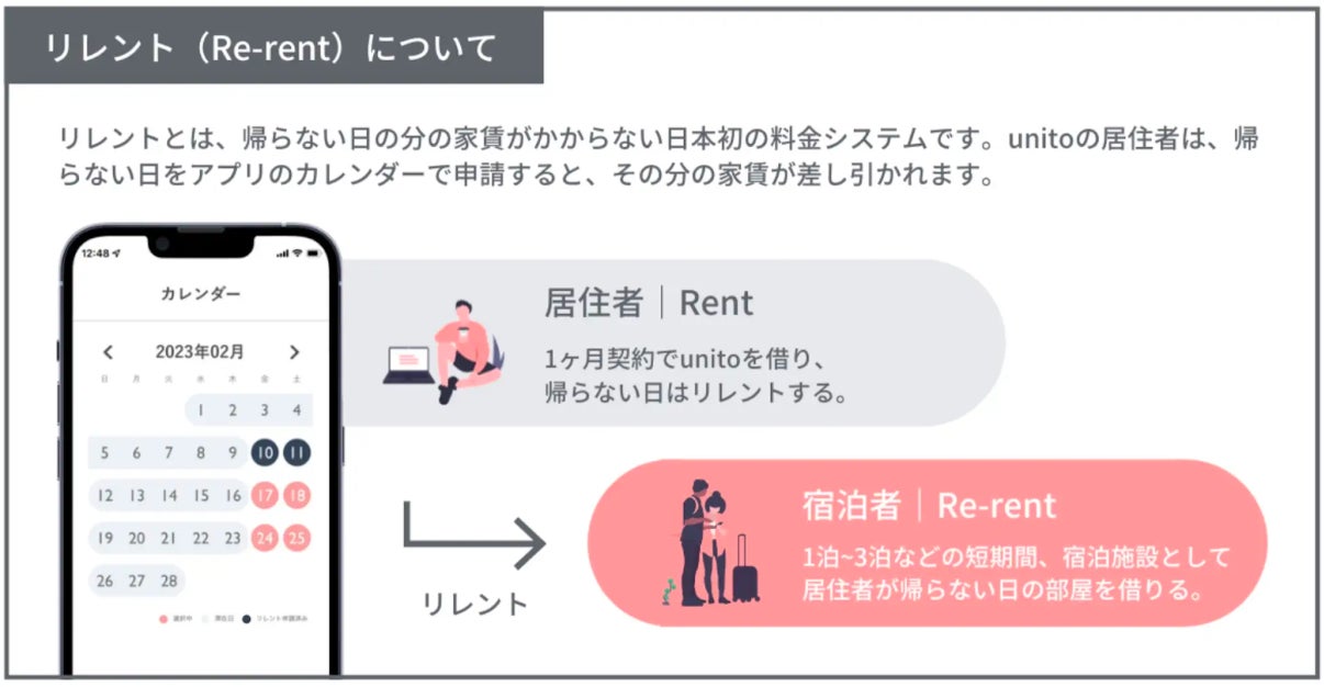 「住む」と「泊まる」の2つの用途に最適化した、最短即日入居が可能なホテルレジデンスです。居住者が家を使わない時間は、ホテルとして貸し出し、その分の家賃を減額する料金システム「リレント」を搭載しています。二拠点生活や出張、長期の旅行など、さまざまなライフスタイルに対応し、フレキシブルな暮らしを実現します。