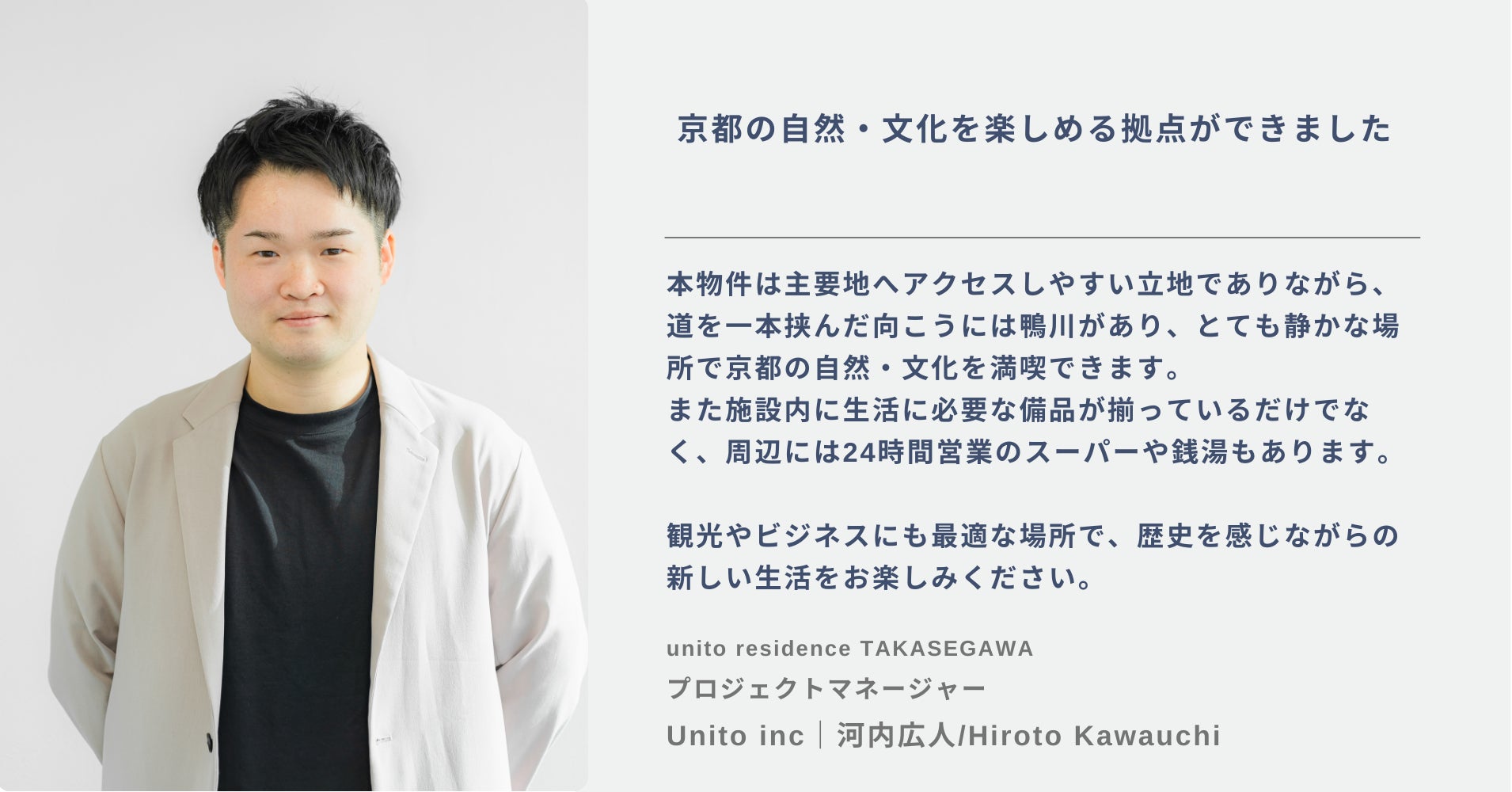 株式会社Unito(本社:東京都千代田区、代表取締役:近藤佑太朗、以下Unito)は、住んだ分の家賃で暮らせるリレント可能なホテルレジデンス「unito residence 京都高瀬川」(正式名称:unito residence Kyoto Takasegawa、読み:ユニット レジデンス キョウトタカセガワ)の物件の運営を開始しました。