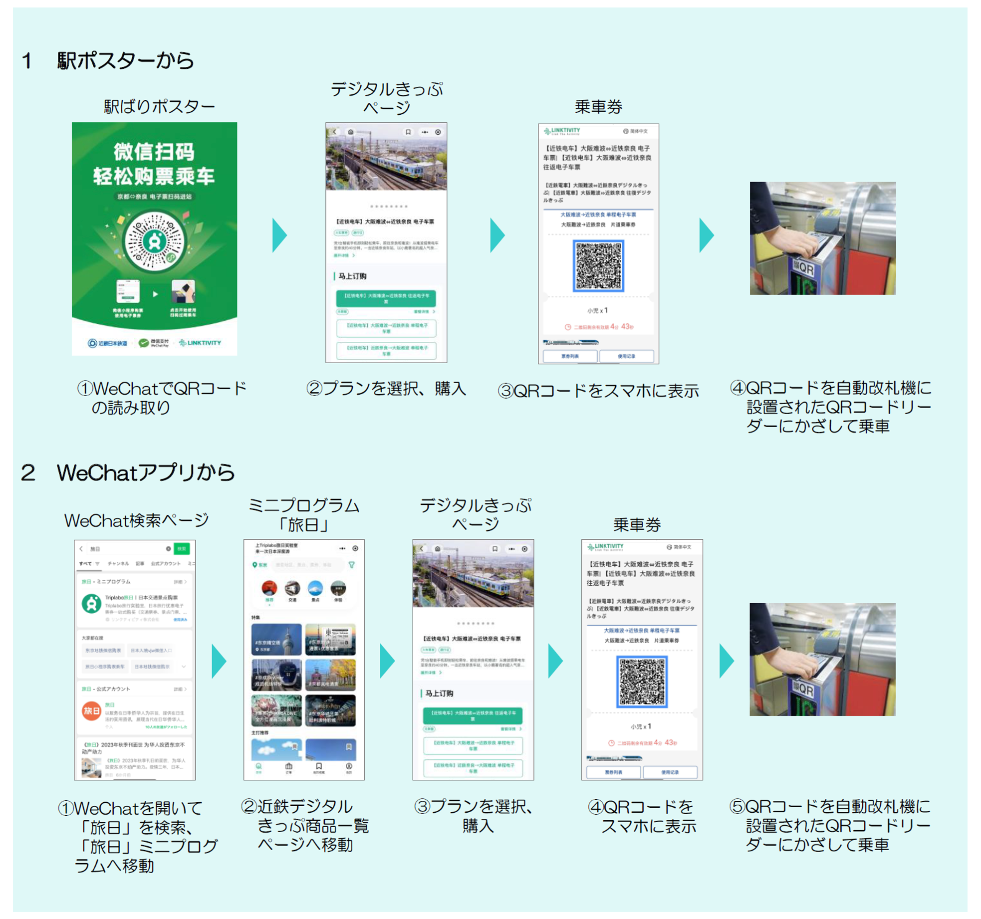 近畿日本鉄道株式会社(代表取締役社長:原 恭、以下「近鉄」)とリンクティビティ株式会社(代表取締役:孔 成龍)は、Tencent Japan合同会社が提供するWeChat Payを利用し、中国からの訪日旅行者に便利に奈良へ観光に訪れていただけるよう、購入から乗車までスマートフォン内で完結するデジタルきっぷをWeChat※1ミニプログラム「旅日※2」内で5月9日(木)から8月31日(土)まで期間限定で発売します。