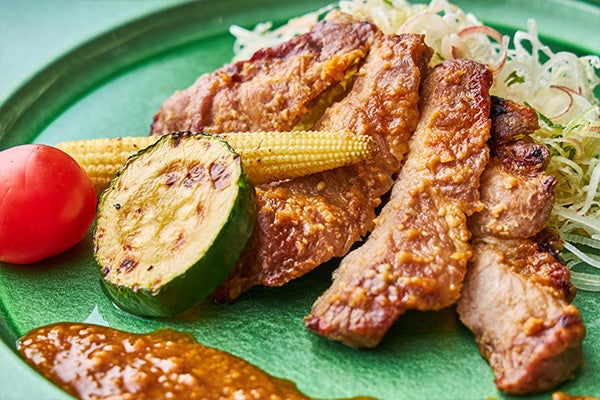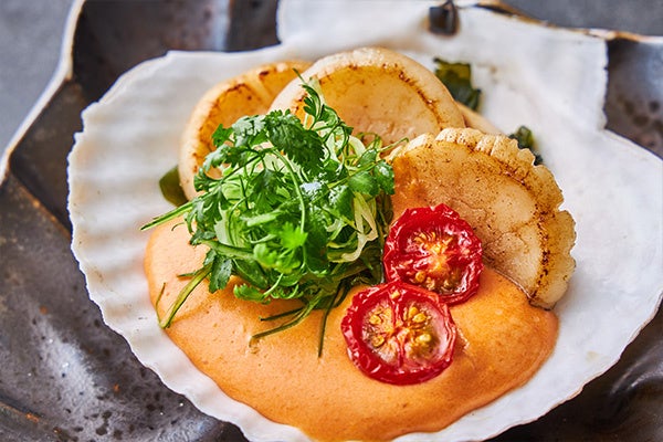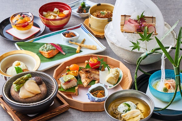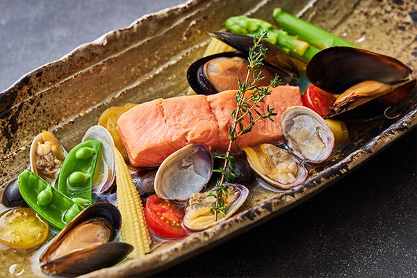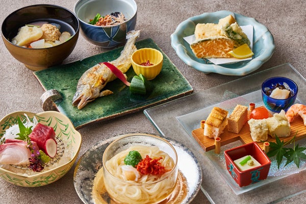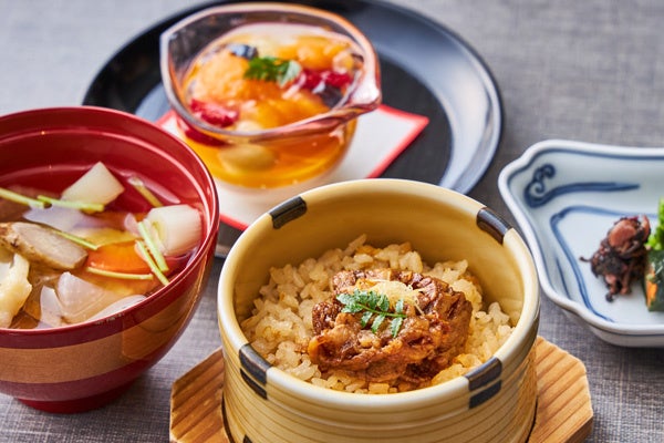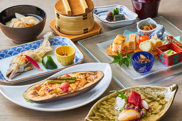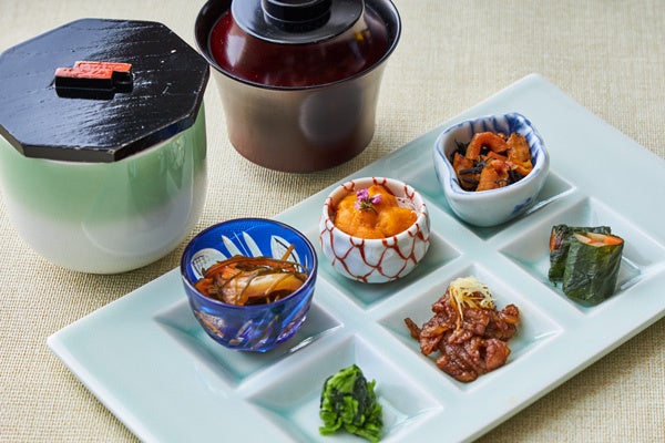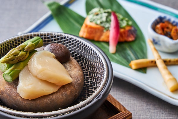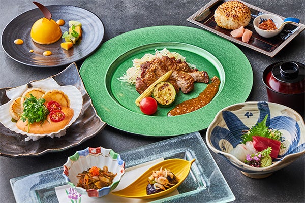 岩手県産の恵みをさまざまな調理方法でご堪能いただける、ランチ限定のメニューです。先付では、春から夏に旬を迎えるホヤを使用した茶碗蒸しをご用意いたします。「海のパイナップル」と称され、ミネラル豊富で甘みとほのかな苦みがクセになるホヤをお楽しみください。焼物では、岩手県名水20選である清水の湧き水で育った、程よく脂がのった旨みの強い“岩姫サーモン”にごまを全体にまぶして焼く“南部焼き”にしてご提供します。南部地方が名産のごまの香ばしさを感じながらお召し上がりください。揚物では、ハーブを加えた飼料と美味しい水で育った国産鶏“みちのく清流どり”を、チーズと一緒に茶巾型にして揚げました。お肉の旨みをしっかり味わえる一品です。食事では、岩手県が開発したオリジナル品種のお米“銀河のしずく”をご用意しました。岩手県ならではの御飯のお供“甘うに”、“奥州いか松前漬”、“いわて牛山椒煮”、“ひじきとホタテひも甘露煮”、“漬物”の盛り合わせをお楽しみください。