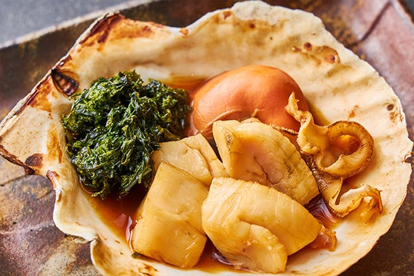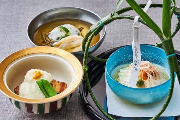 食事の最初を飾るのは、クリーミーな甘さが特徴の岩手県産“甘うに”を合わせた“長芋素麺”です。長芋を麺に見立て、シャキシャキの食感と、涼やかな見た目が食欲をそそる一品です。前菜では、うにと鮑を使った三陸地方の郷土料理“いちご煮”や“奥州いか松前漬”などを堪能いただけます。お椀では、肉厚で弾力があり風味豊かな三陸わかめの真丈と、三陸海岸を代表とする魚“アイナメ”を骨切りし、葛粉をまぶして軽くゆでることでつるりとした口当たりを楽しめる“アイナメ葛打ち”をご用意しました。焼物では岩手県産の“本鱒”を南蛮焼きで、煮物では岩手県の銘柄豚“岩中豚”の角煮をお召し上がりいただけます。他にも、岩手県産の帆立貝を石焼きで、いわて牛は時雨煮にしておこわにのせてご提供します。しっかりこねた薄くコシのある生地と、野菜を煮込んだ郷土料理「ひっつみ汁」もおすすめです。デザートは低温長時間発酵させることでもちもち感と生乳の甘い香りが残る“岩泉ヨーグルト”を使ったパンナコッタと、レモングラスゼリーをお楽しみください。