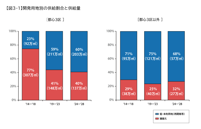 都心3区では、14~18年には約8割であった「建替え」の割合が、19年以降では4割まで低下し、開発用地の主体が「低・未利用地(再開発等)」へとシフト。都心3区以外では、14年以降継続して「低・未利用地(再開発等)」が開発主体となっています。