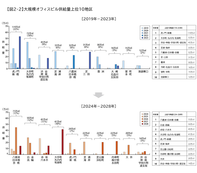 ・地区別の集計では、過去5年間では「虎ノ門・新橋」の供給量がトップでしたが、今後5年間では「八重洲・日本橋・京橋」が最多となる見込みです。また、過去5年間で圏外だった「白金・高輪」「赤坂・六本木」が、今後5年間ではそれぞれ2位・3位に上昇する予定です。