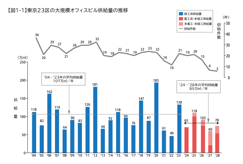 ・24年以降の5年間では、23年を超える年はなく、今後5年間の平均供給量も過去20年間の平均107万㎡を下回る85万㎡に留まり、供給は抑制傾向となる見込みです。