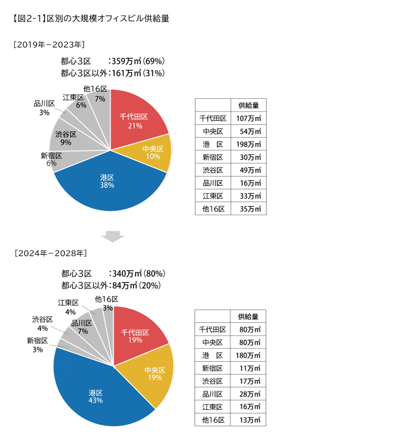 ・過去5年間と今後5年間の供給割合を区ごとに集計したところ、両期間ともに都心3区(千代田区・中央区・港区)の割合が7割程度を占めています。傾向として、千代田区の割合が減少する一方で、中央区と港区の割合が増加しています。