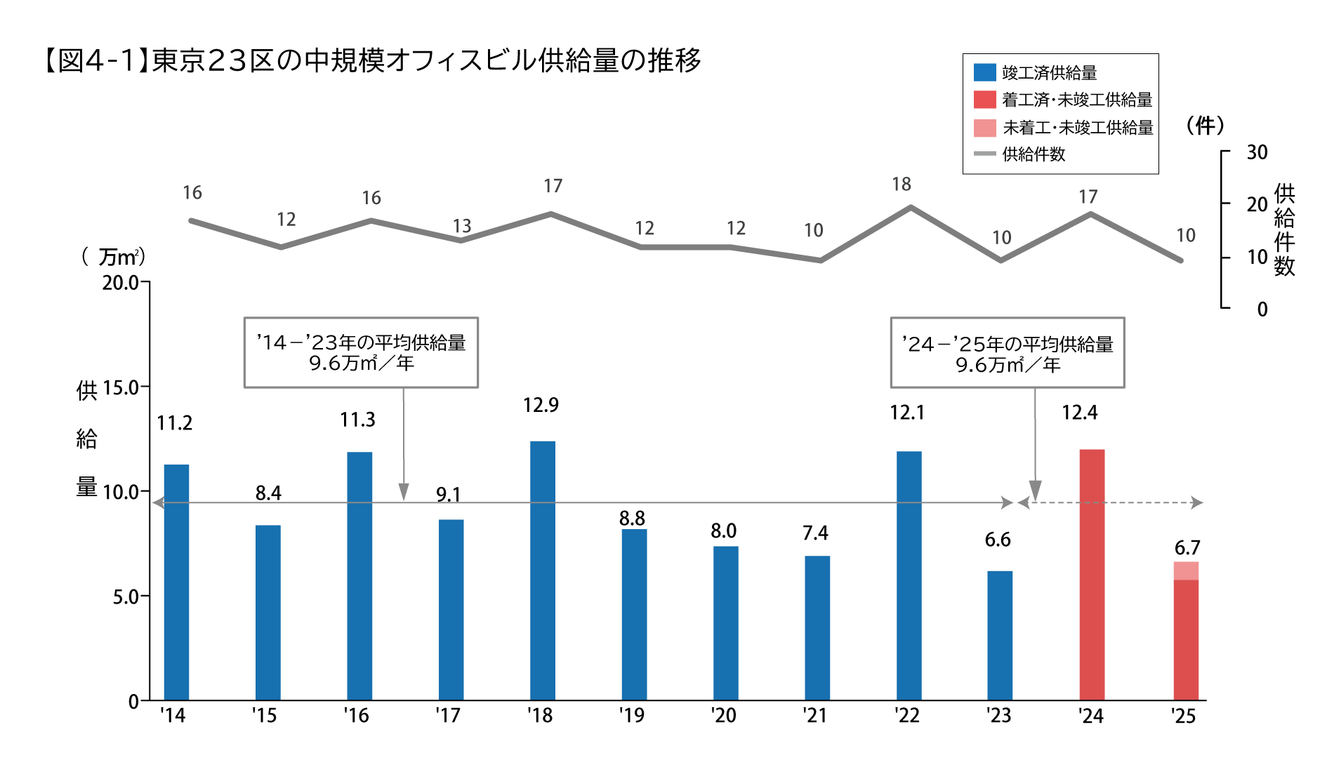 23年の中規模オフィスビル供給量は6.6万㎡となり、まとまった供給のあった22年に対し再び減少に転じました。24年は12.4万㎡、25年は6.7万㎡と上下するものの、今後2年間の平均供給量は9.6万㎡となり、過去10年間の平均とほぼ等しく、供給量は安定的に推移する見通しとなっています。