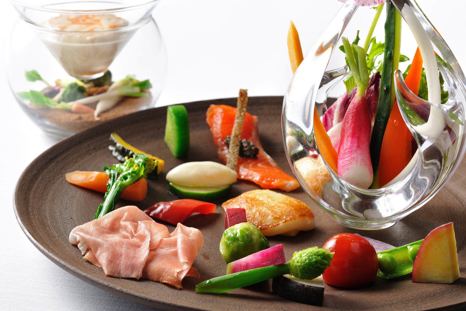 那須の恵みをふんだんに盛り込んだ一皿「農園のピンツィモーニオ」。那須に縁のある陶芸作家、小野澤 弘一(おのざわ こういち)氏が焼き上げた黒皿には、当リゾートの農園 「アグリガーデン」で採れた野菜に加えて、那須で生産が盛んなチーズやヤシオマスが並び一目で恵みを感じられます。ガラスの器に添えられたスティック野菜は手でつまみ、収穫しているような感覚で食べられる一皿です。みずみずしい野菜をバーニャフレッダと組み合わせて楽しめます。