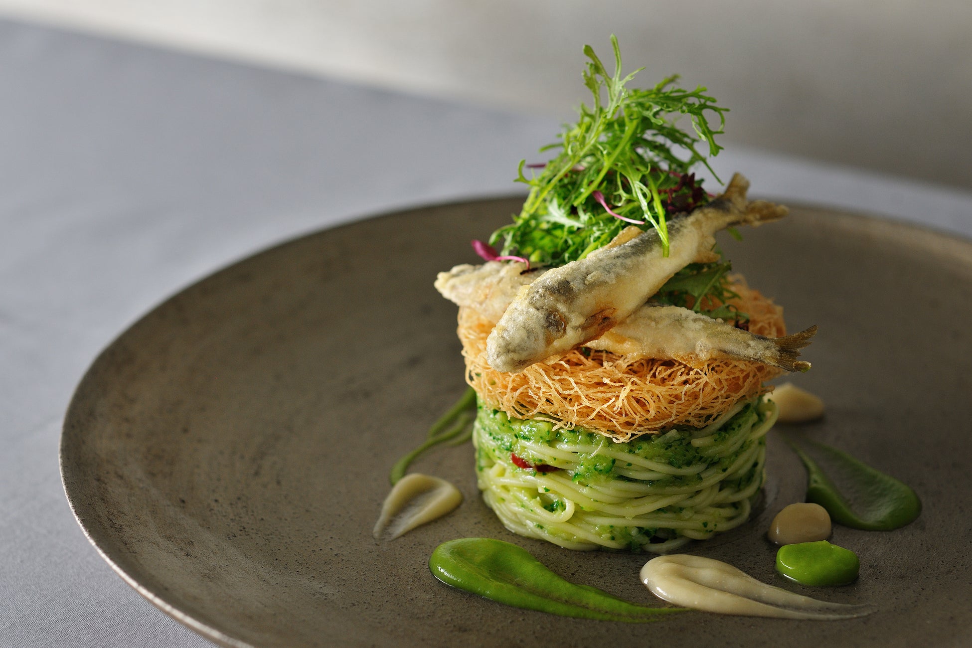 旬の川魚「稚鮎」を使用したパスタを提供します。繊細な口当たりが特徴のパスタ・フェデリーニに、胡瓜のソースを絡めた爽やかな味わいが特徴です。加えて、器に添えられた胡瓜とジェノベーゼのソース、うるか(*1)を使用した2種類のソースとも合わせて楽しめます。パスタの上には、サクサクとした食感のカダイフとフリットした稚鮎を添えており、さまざまな食感を同時に楽しむことができる一品です。
