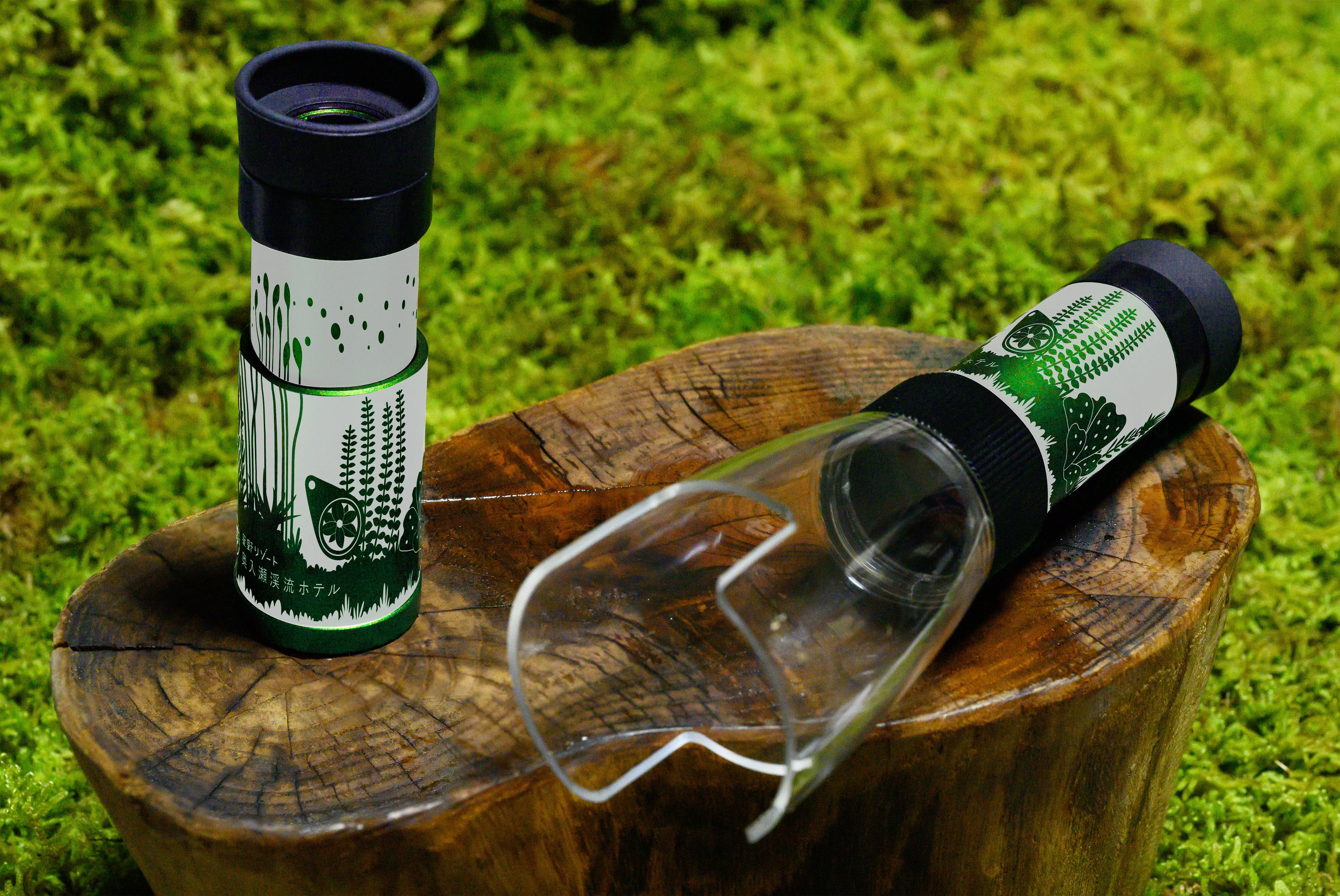当プログラムでは、奥入瀬渓流のいたるところに生息するコケをくまなく観察できる、オリジナルスコープを用意しました。高さ約20mの樹木や岩の上、水辺に生えているコケまで観察できる、変幻自在のスコープです。付属のマイクロスタンドと組み合わせることで、6倍から18倍と倍率を変えることができます。木の幹の少し上で見られる「エゾヒラゴケ」や水際の石や流れの中の岩上に生息する「タニゴケ」など、普段歩く目線ではどうしても観察することが難しいコケの観察にもぴったりです。さらに、スコープは胴を伸ばすと可愛らしいコケの胞子体がでてくるデザインが施されており、ユニークなそのデザインを身近に感じながら、繊細なコケをじっくり観察できます。