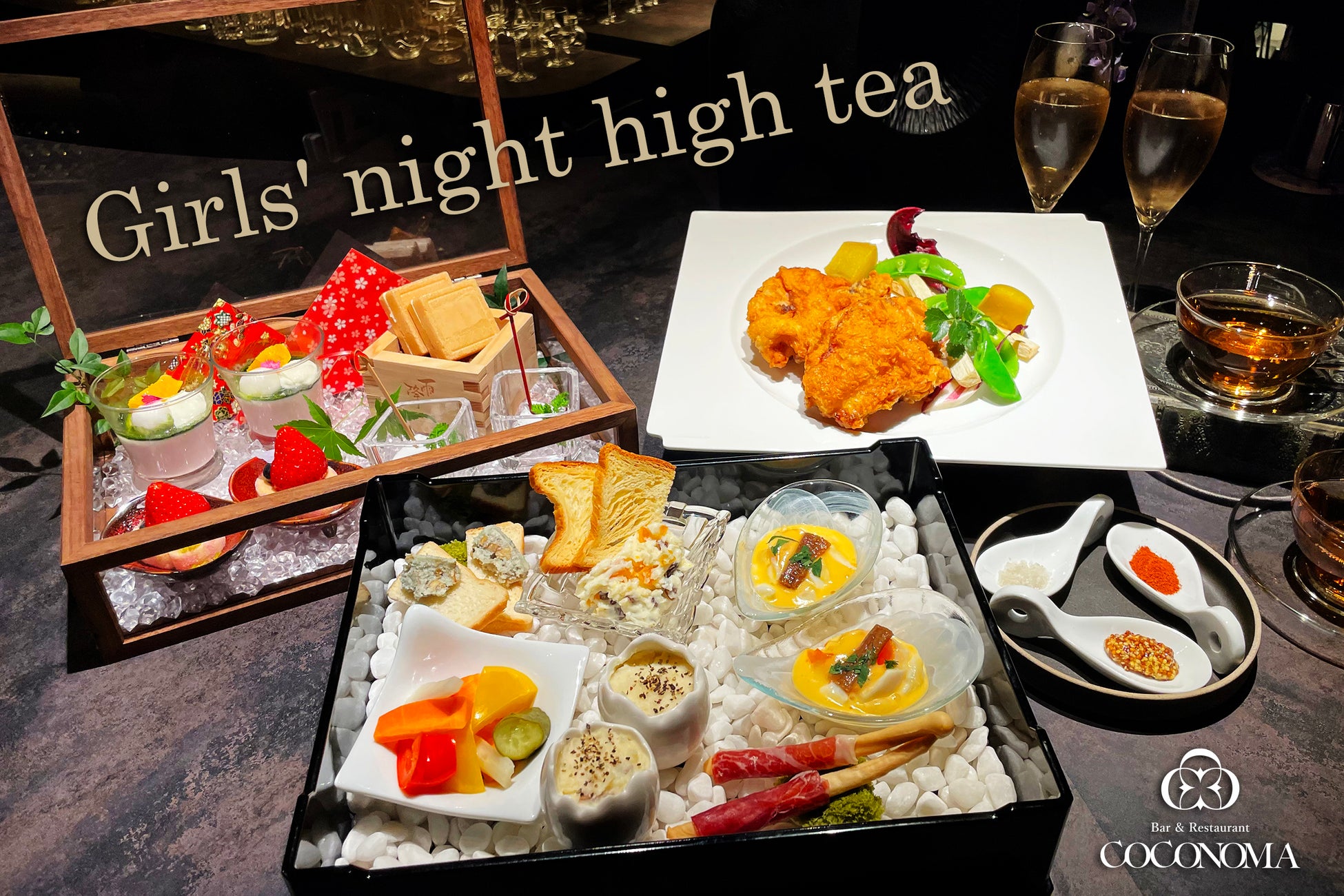 西麻布のレストラン、Bar & Restaurant COCONOMAがプロデュースする「女子会ナイトハイティー」では、開放的な和モダンの空間で、絶品料理と厳選されたドリンクを楽しめます。フォトジェニックな前菜「玉手箱 前菜6種類盛り合わせ」、サクサク感がクセになる「佐賀県産有田鶏のクリスピーチキン」、そして「ジュエルボックス スイーツ4種類」で極上のデザートタイムを。2種類の飲み放題プランもご用意しておりますので、お好みに合わせてお選びいただけます。