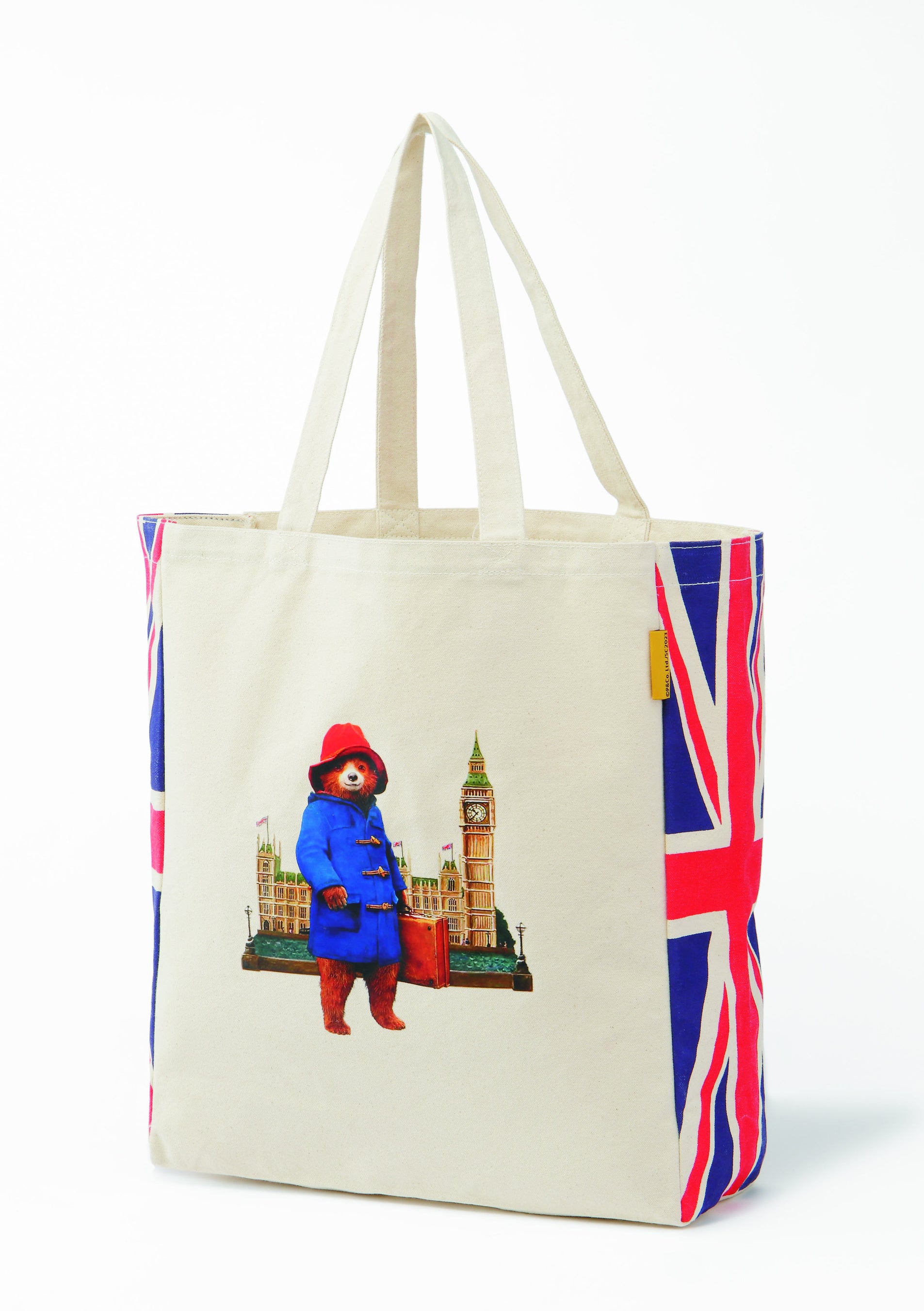 ビッグベンの前でたたずむパディントン™が愛らしいトートバッグ。側面のユニオンジャック柄が印象的です。