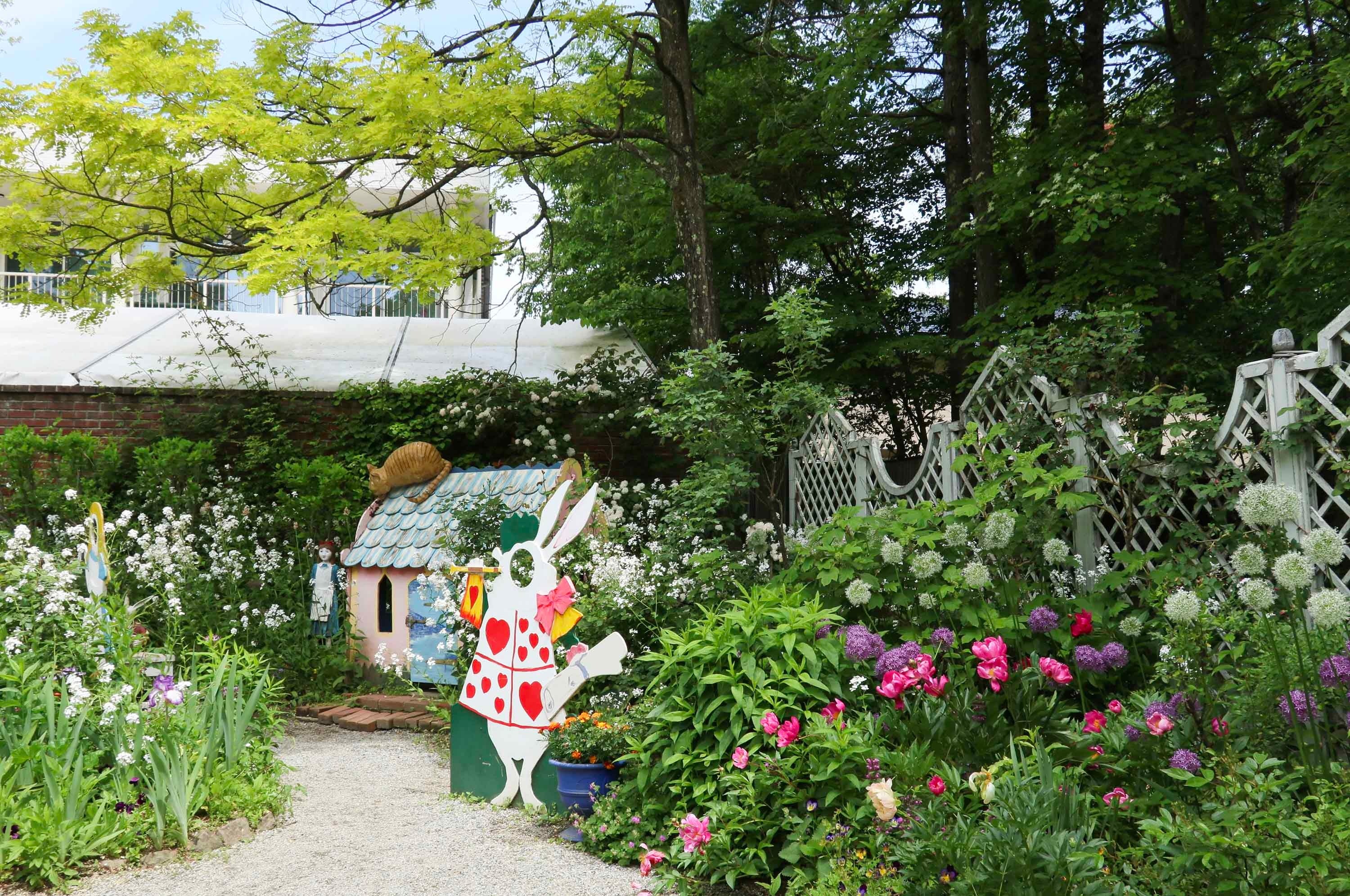 英国庭園の第一人者「ケイ山田」氏が“不思議の国のアリス”をテーマに、英国式寄植えを展示。ファッションブランド〈バラ色の暮し〉のブラウス、ワンピースなどがお目見えするライフスタイルイベントも同時開催。