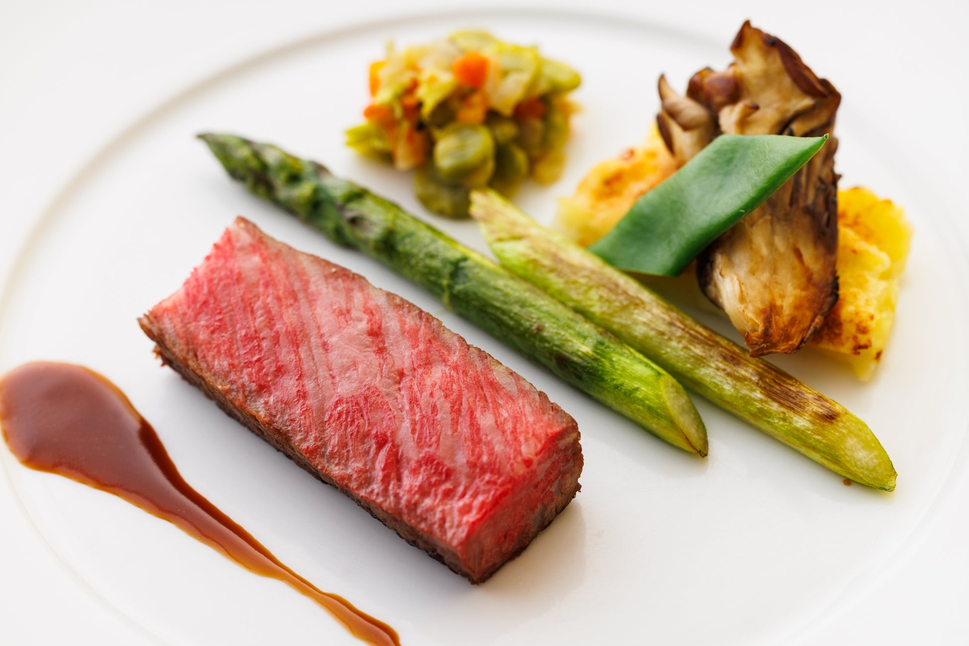 黒毛和牛サーロインステーキ 会津産打ち豆煮込み 会津アスパラガスのソテーと共に