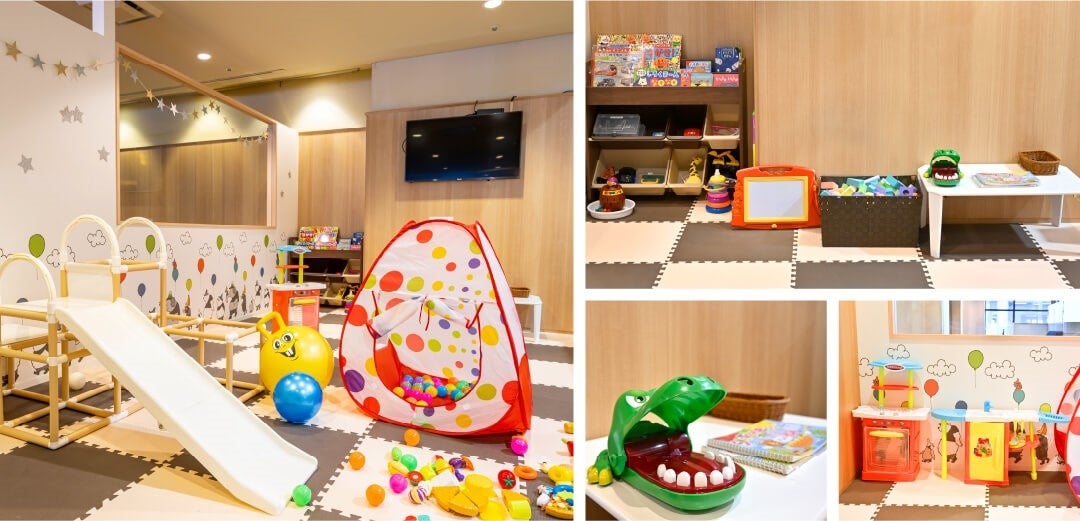 「小さなお子様が楽しく自由に遊べるキッズスペースを完備しています。大型テレビや滑り台、絵本、知育玩具