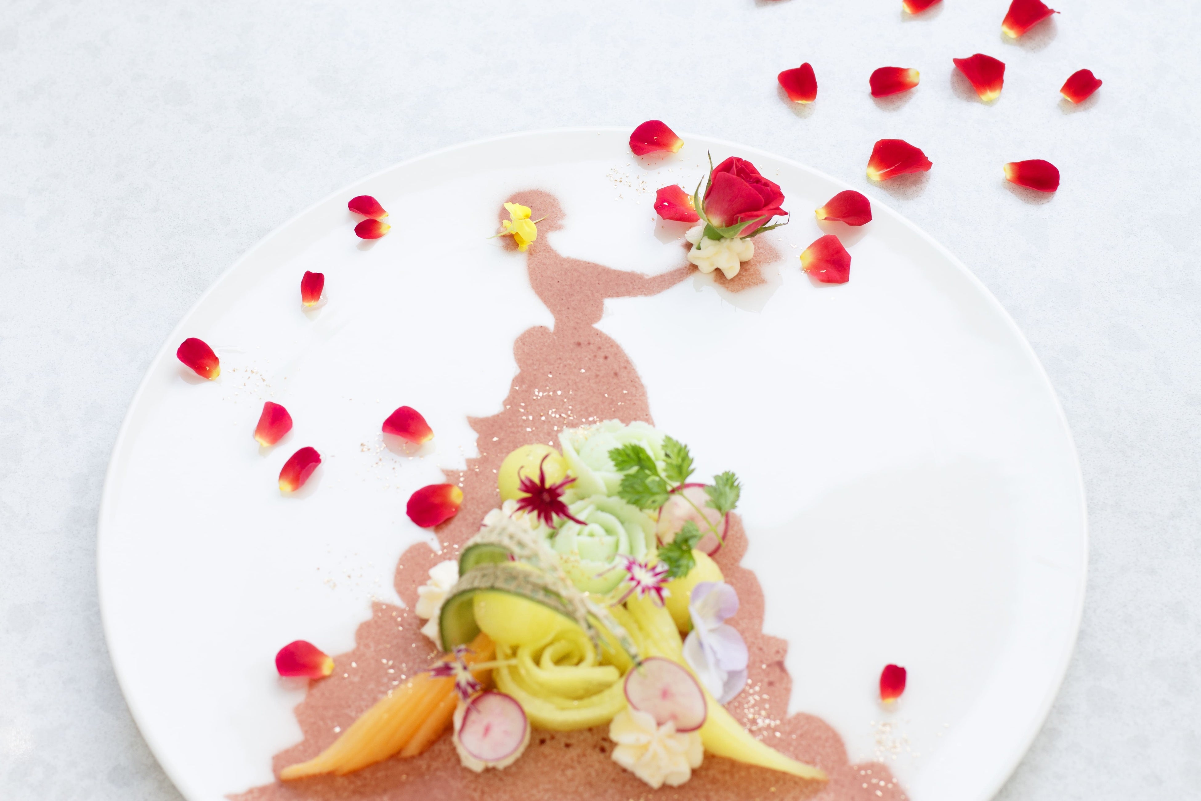 コース2品目には、シグネチャープレート「マスクメロンのサラダ」をご用意。カカオパウダーでかたどられた女性にドレスをお仕立てしていく様子をご覧いただけます。髪飾りやブーケまで再現し可憐にドレスアップされた、シェフ山口の世界観が溢れる新感覚のサラダはセレブレーション感満載です。