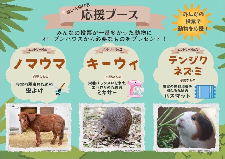 天王寺動物園の動物も健康で持続可能な生活をしてほしいという思いで、参加者と一緒に動物を応援できるブースを設置いたします。応援したい動物 キーウィ、野間馬(ノマウマ)、テンジクネズミの中から 1 つを選び、投票していただきます。一番投票が多かった動物には、動物福祉向上のための物品を当社からプレゼントいたします。