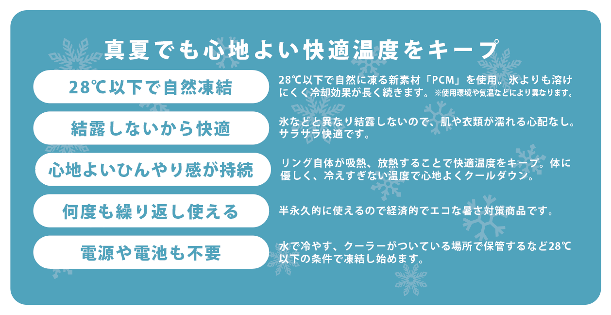 …28℃以下で自然に凍る冷却素材「PCM」を使用。氷よりも溶けにくく冷却効果が長く続きます。※使用環境や気温などにより異なります。