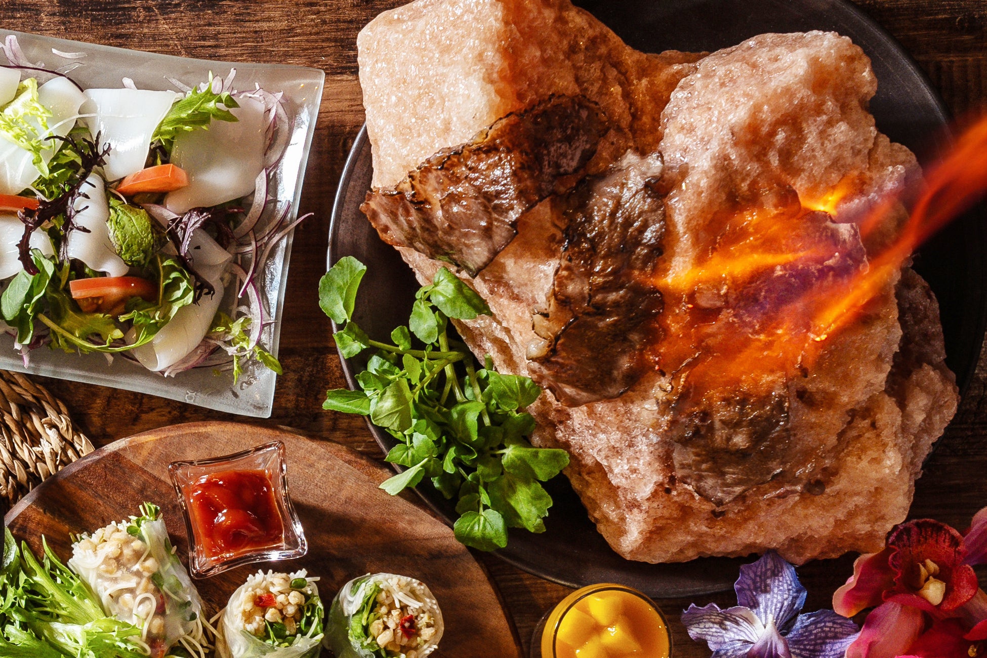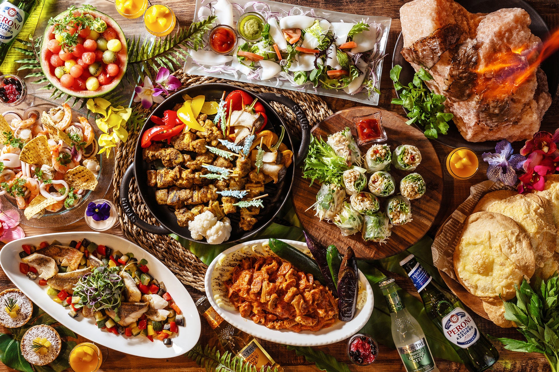 トラウトサーモンの青唐辛子マリネ ガーリック風味(タイ)/シーフードのチョジャンのタコス(韓国)/タイ風春雨の生春巻き[ヤム ウン セン] (タイ)/烏賊のセビーチェ(ベトナム)/葉野菜のサラダ(日本)/トムヤムクン(タイ)/ホテルオリジナルカレー(日本)/海南鶏飯(タイ)/カサゴのポワレ 香味野菜ソースで(日本)/ローストポークのチェユクポックム風(韓国)/サティー(インドネシア)/若鶏の甘辛炒め(中国)/トリッパの煮込み(台湾)/ロティチャナイ(マレーシア)/フルーツ盛り合わせ(西瓜/パイナップル)