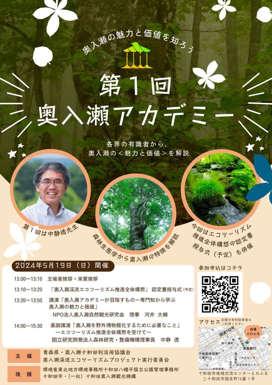 ※(一社)十和田奥入瀬観光機構は、奥入瀬アカデミーの主催である奥入瀬十和田利活用協議会及び奥入瀬渓流エコツーリズムプロジェクト実行委員会の事務局として、また、本イベントの後援として参画しています。