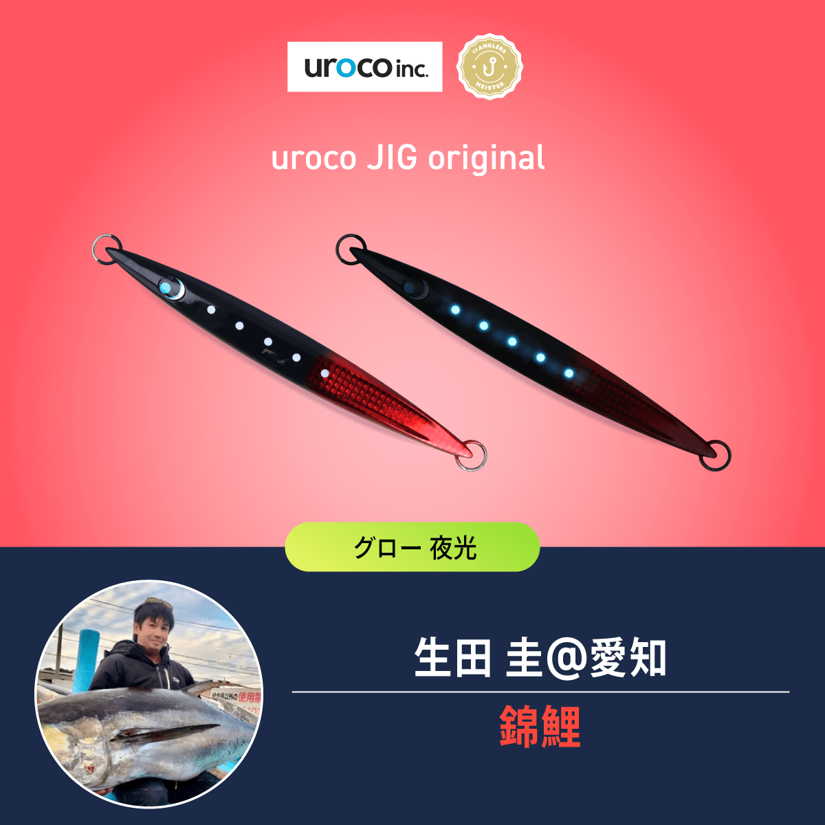 抜群の使いやすさと操作感で大人気の「uroco JIG original」。 テールのエッジにより、フォール時に横へ向かせることが出来て、 細身のフォルムから軽い力でシャクルことができるデザインとなっています。 青物や真鯛、根魚、タチウオなど様々な魚種にも対応できる、とても使いやすいジグです。