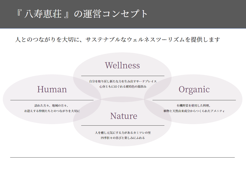 新しい時代のウェルネスツーリズムのリーダーとして、八寿恵荘は訪れるすべての人々にリフレッシュの機会を提供し、日常から離れて自分を見つめ直す特別な場所となることを約束します。「人」との深い関係、「自然」の中での再発見、「ウェルネス」を通じた心身の癒し、「オーガニック」なライフスタイルの実践という四つの要素を組み合わせ、訪れるすべての人に豊かな体験を提供します。