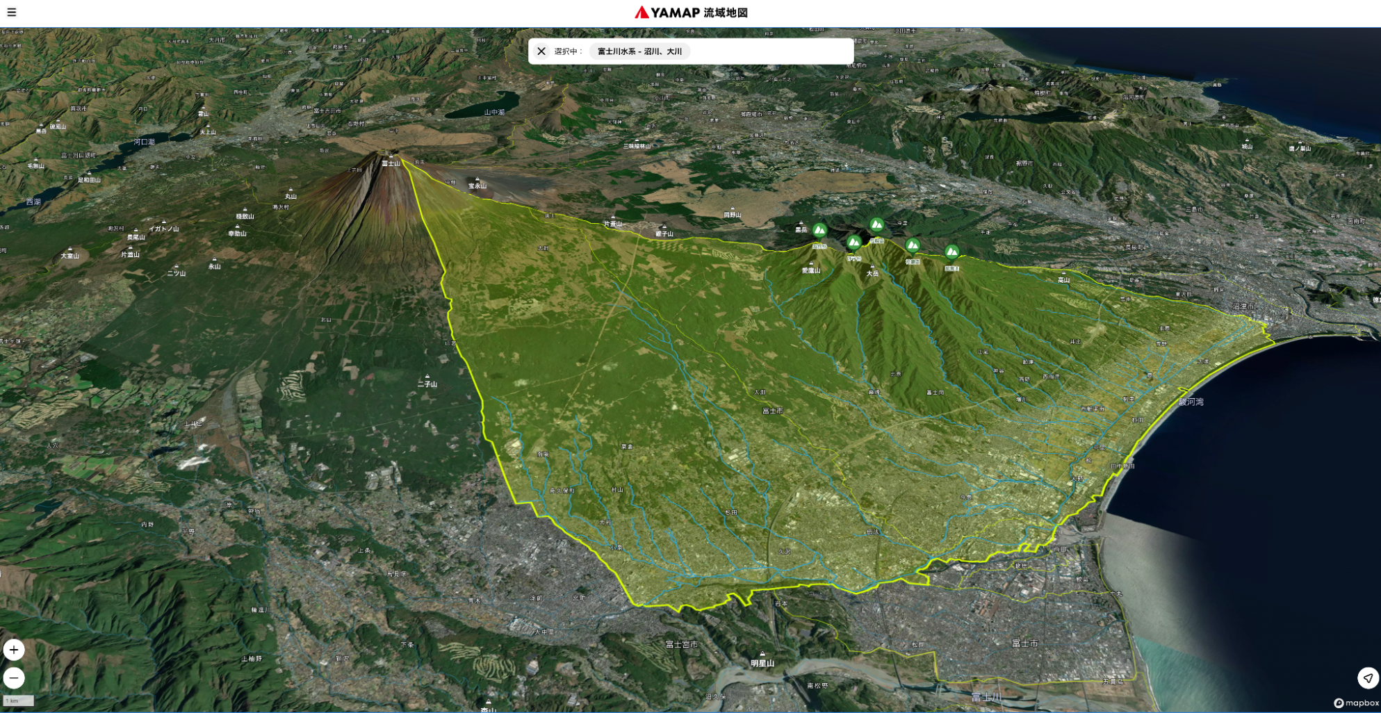 ・山頂マークを選択すると、その山を含む流域がフォーカスされ流域名、山名が表示されます