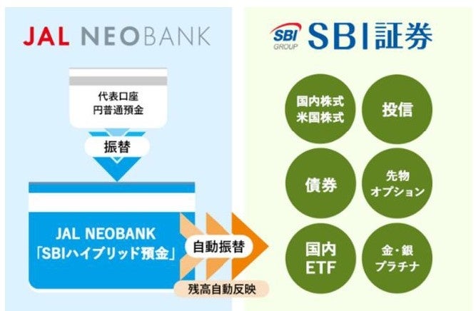 JAL NEOBANKの「SBIハイブリッド預金」は、SBI証券と連携した円預金です。JAL NEOBANKの「SBIハイブリッド預金」へ預け入れたお金は、お客さまのSBI 証券口座の買付余力に自動的に反映され、株式や投資信託、債券などの取引に便利にご利用いただけます。
