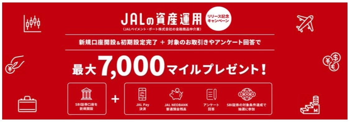 日本航空株式会社(本社:東京都品川区、代表取締役社長: 鳥取 三津子、以下「JAL」)、JALペイメント・ポート株式会社(本社:東京都品川区、代表取締役社長: 仁司 哲、以下「JALペイメント・ポート」)と、株式会社SBI証券(本社:東京都港区、代表取締役社長: 髙村 正人、以下「SBI証券」)は、2024年5月14日(火)より、金融商品仲介業務として「JALの資産運用」サービスを開始します。