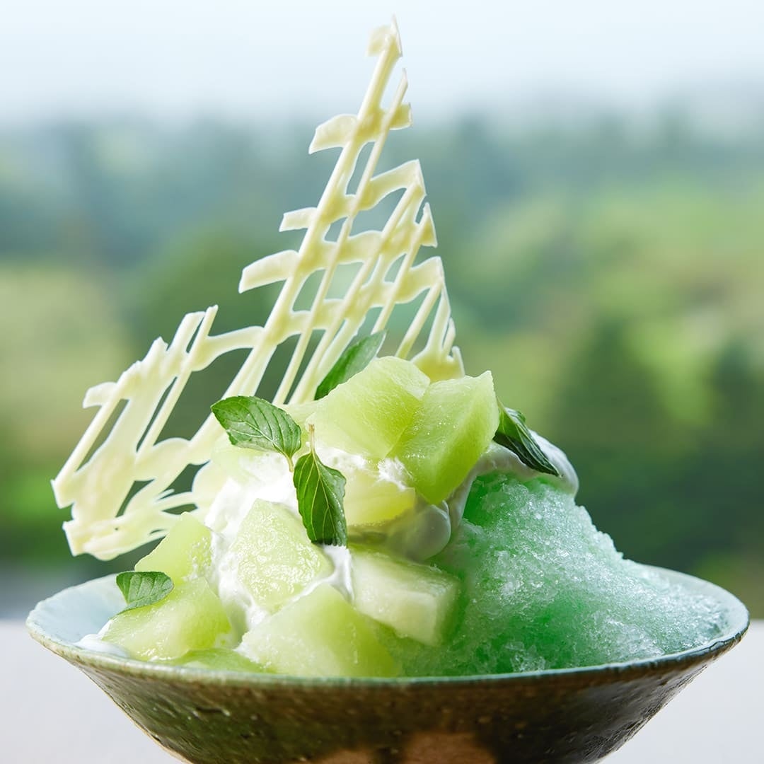 一本のメロンの木からたった一玉のみ収穫される静岡県産クラウンメロンとアールスメロンが主役のかき氷「メロンメロンメロン」は、高貴な香りと熟した甘い果汁が口いっぱいに広がります。自家製メロンシロップとふわふわのココナッツクリームによって一層奥深い味わいになり、そびえ立つチョコレート細工がラグジュアリー感を演出します。