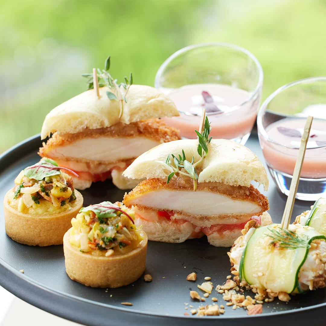 セイボリーには、桃と静岡県産の食材を豊富に使用した 4種類をご用意します。その中には、桃と香辛料などを煮詰めたチャツネと富士御殿どりをベーグルで挟んだチキンカツサンド、桃とえびの旨味が凝縮されデュカスパイスがエキゾチックなテイストを放つズッキーニ巻き、静岡県産の焼きとうもろこしとチョリソーに桃のサルサをのせた変わり種のキッシュ、そして、ピンクバルサミコの華やかな酸味が効いた桃の冷たいスープが含まれます。また、何度でもオーダーできるオリジナルコーヒーやロンネフェルトティーでは、生姜ベースでレモングラスやシナモンが香るスパイシーな「モータースポーツブレンド」や、程よい渋みのブラックティーにバラやマンゴーのアロマと緑茶のようなすっきりとした後味でリラックスできる「富士山ブレンド」の2種類のオリジナルブレンドが特に人気です。