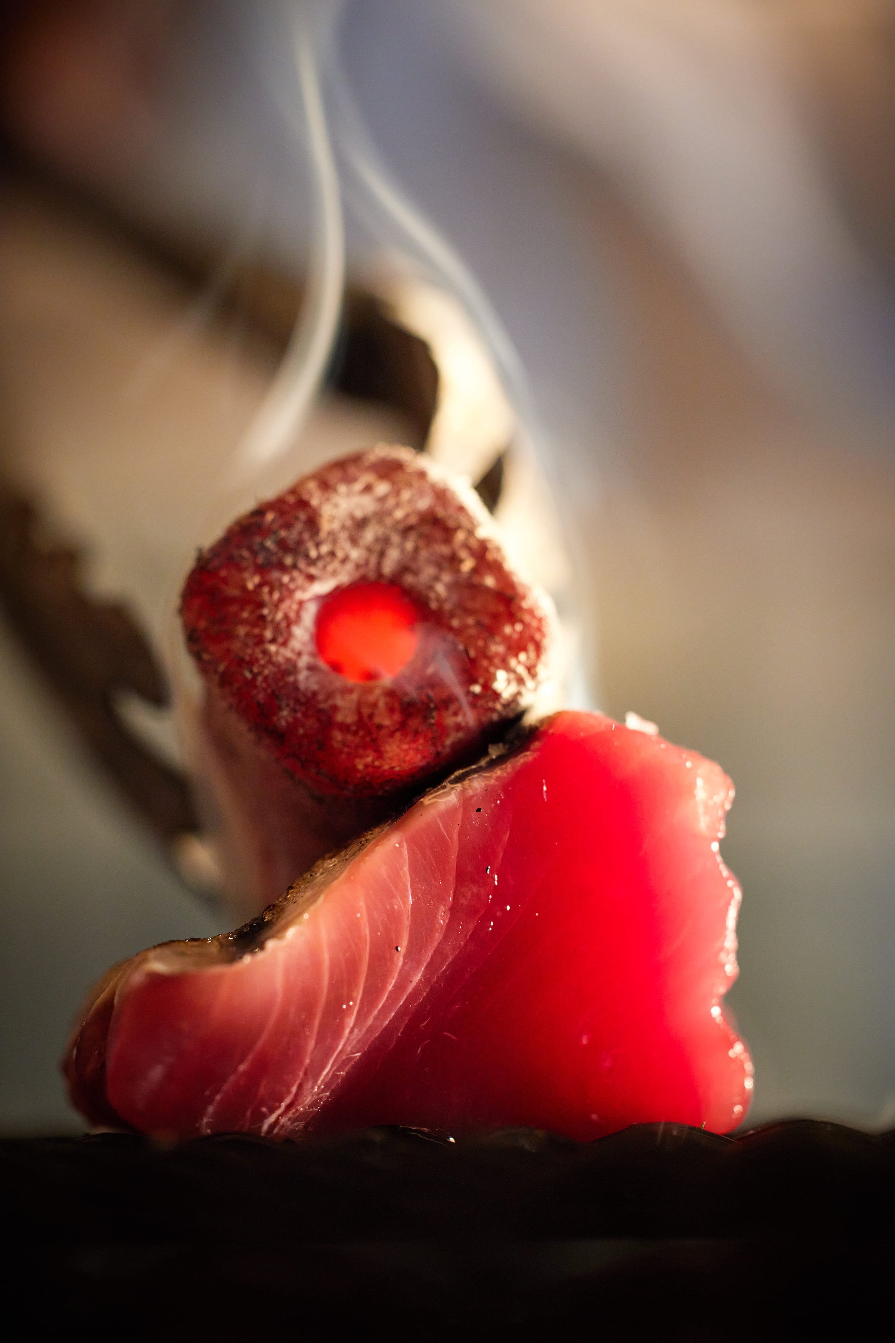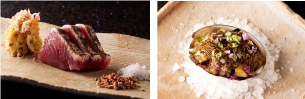 用意します。全てのコースで提供される鰹のタタキ備長炭炙りは、目の前で皮目を備長炭で直接炙ることで香ばしい香りが広がり、食欲をそそります。さらに、ガーリックペッパーやコリアンダー、ピンクペッパーなどを調合したシェフオリジナルのスパイスが、醤油やワサビでは味わえない鰹の旨味を引き出します。OMIKA コースと OYAMA コースで味わえる蝦夷アワビの炭火焼きは、ヘルシーな食材として注目されている海藻「アカモク」と長ネギの鰹節和えをソースとして添え、夏らしいさっぱりとした味わいに仕上げています。メイン料理には特選和牛と季節の野菜の炭火焼きを、そして、〆には熟練寿司シェフが握る焼津ミナミマグロの中トロを含む、旬魚の握り寿司3貫をご用意します。
