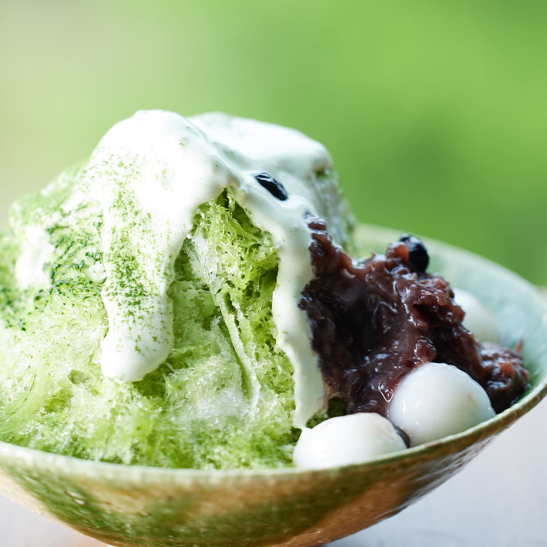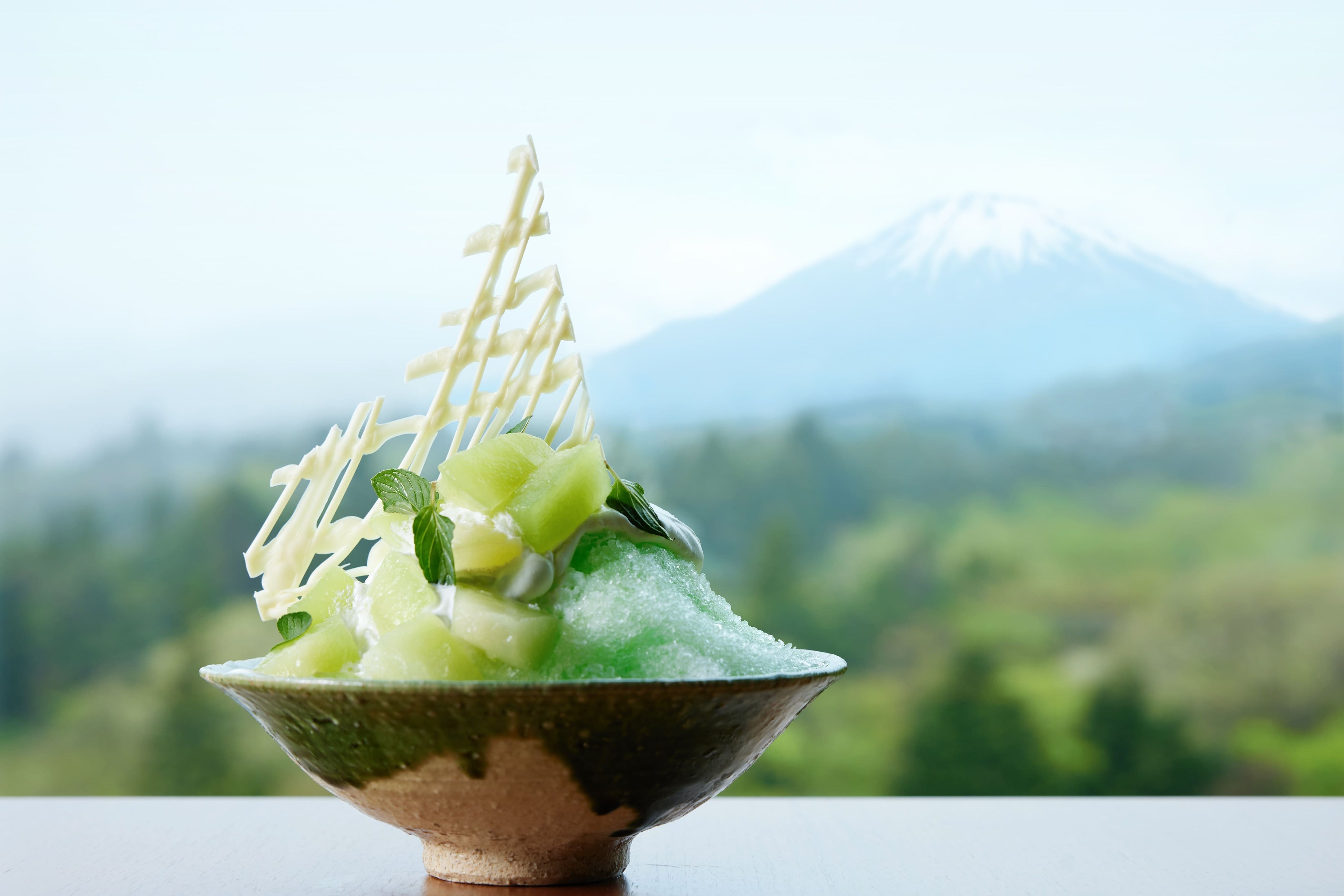 富士山の絶景を誇る「TROFEO ラウンジ」では、こだわりの食材を使用 した3種類のかき氷を7月13日(土)から9月16日(月)まで提供し ます。夏に青々と色づく裾野と相まって凛々しい姿に変わる富士山をイ メージした「静岡県産抹茶と富士山餡子のかき氷」は、丸七製茶の抹茶を 贅沢に使用した濃い抹茶ソースで彩られ、クリーミーな練乳クリームが たっぷりかかっています。餡子には、北海道十勝産の厳選された小豆と、 富士山の天然水で作られた旨味豊かな「富士山餡子」を使用し、モチモチ した白玉も添えられます。洗練された静岡県産食材によって昇華された クラシックな味わいをご堪能いただけます。