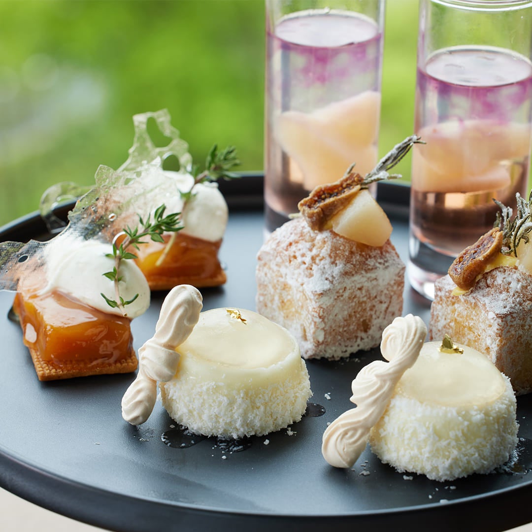 桃のタルトタタンは、一般的なリンゴのものとは異なり、柔らかく繊細な実が煮崩れしないよう、高度な技術で形づくられています。一口食べれば口の中でとろけるような感覚が広がり、バニラクリームと合わさっても重さを感じないよう、タイムの爽やかな風味を纏わせました。また、ミントゼリーが白桃ムースの繊細な甘みを引き立たせる桃のヴァシュランや、芯の固いローズマリーを砂糖漬けにすることでユニークな食感が楽しめる桃と無花果のパウンドケーキ、そして、レモングラスの香りがリフレッシュに最適な桃のコンポートのジュレもご用意します。