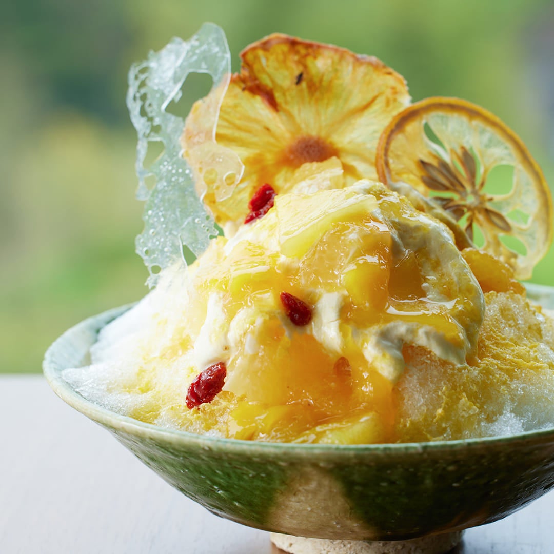 柑橘類の爽やかな香りと南国フルーツの甘味が口いっぱいに広がる「伊豆シトラス&トロピカルフルーツ」は、ゴロゴロとしたマンゴーと、パッションフルーツやパイン、バナナを合わせたトロピカルソースやクリームを回しかけたリゾート気分が味わえるかき氷です。伊豆産ニューサマーオレンジのセックを飾り、オレンジ色のビタミンカラーが陽の光に輝く写真映えもするかき氷です。