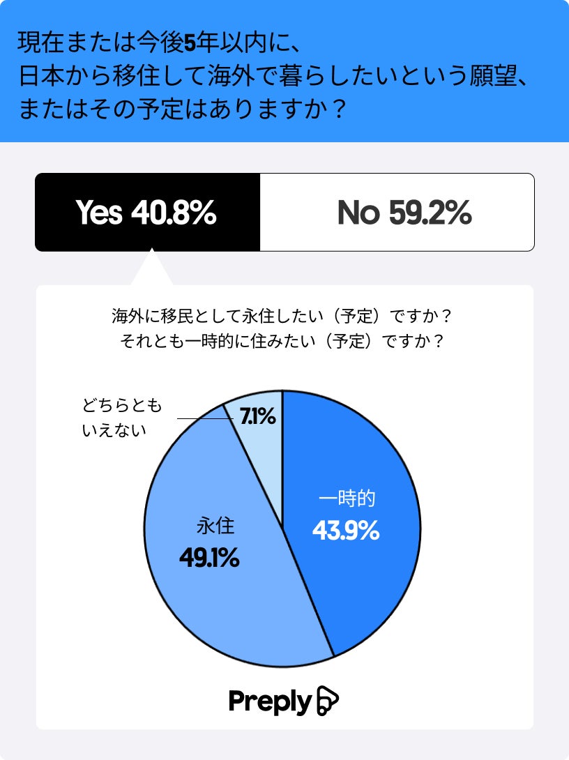 「現在、または今後5年以内に、日本から移住して海外で暮らしたいという願望、またはその予定があるか?」を尋ねたところ、40.8%が「はい」と答えました。さらに、「はい」と答えた人の中で、いずれ日本に帰ってくるつもりで一時的に海外に住みたいのか、それとも永住したいのか尋ねたところ、永住したい人が49.1%で、一時的に住みたい人の割合(43.9%)よりも多いことが分かりました。