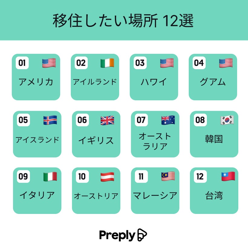移住したい国について尋ねたところ、人気の12ヶ国が分かりました。その中でもアメリカは特に人気で、世界トップの経済大国に行って、キャリアアップや魅力的な労働賃金を期待しているのかもしれません。