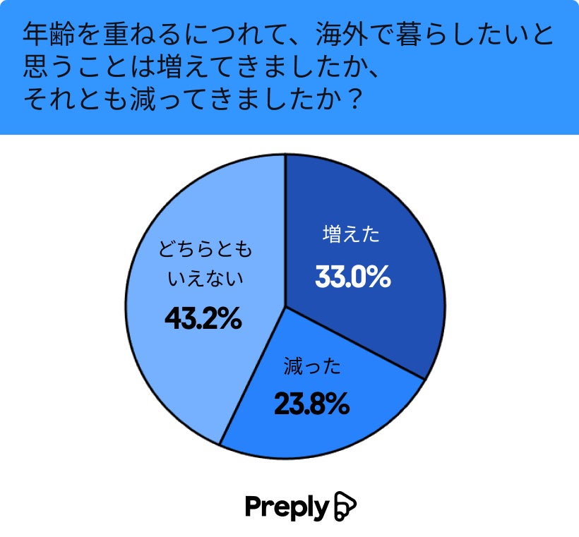 「年齢を重ねるにつれ、海外で暮らしたいと思うことは増えてきましたか、それとも減ってきましたか?」という質問に対して、33%が「増えた」と回答し、減った人の割合(23.8%)よりも多いことが分かりました。